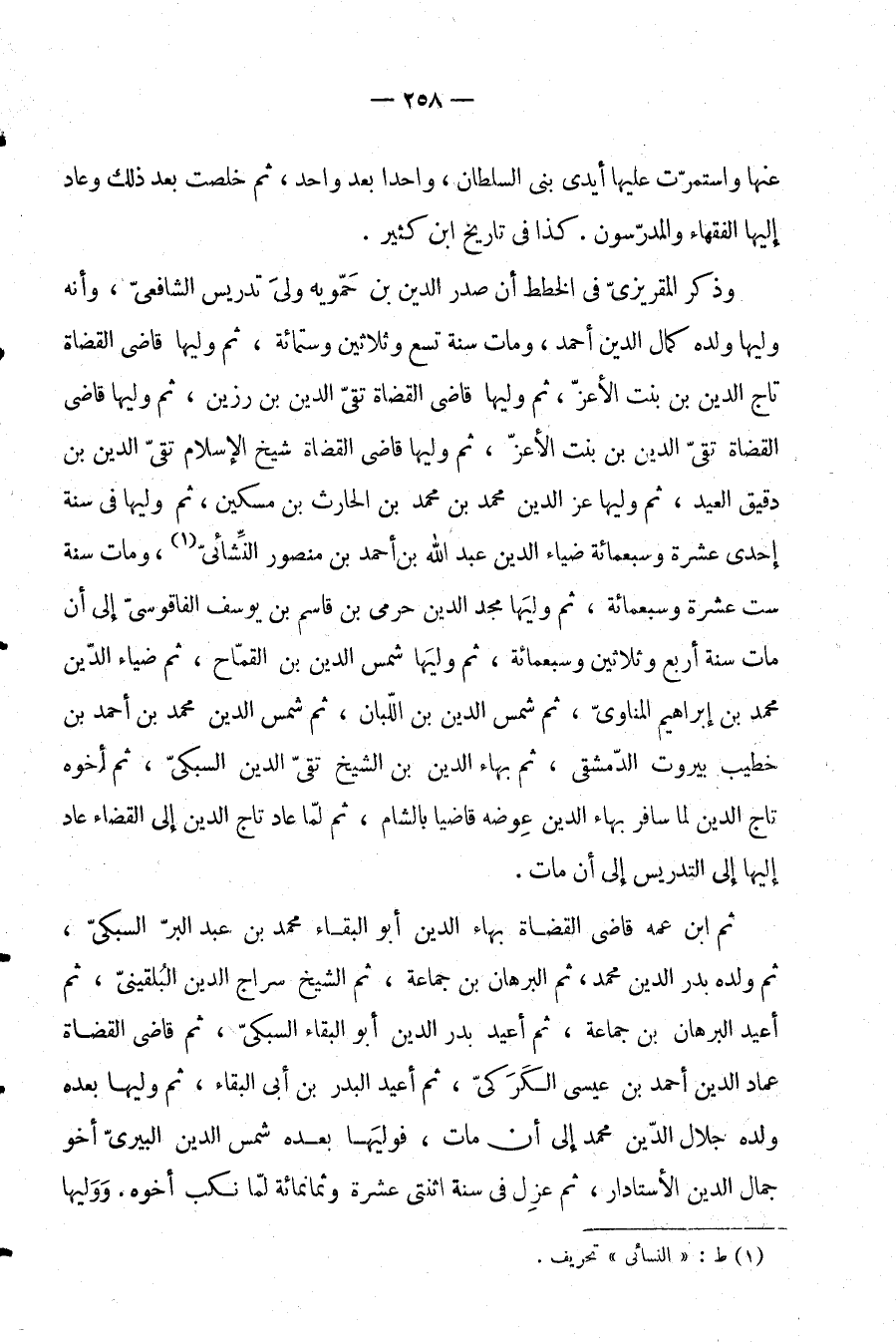 عنها واستمرت عليها أيدي بني السلطان، واحدا بعد واحد، ثم خلصت بعد ذلك وعاد إليها الفقهاء والمدرسون. كذا في تاريخ ابن كثير.