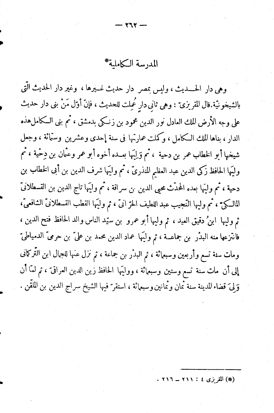 وهي دار الحديث، وليس بمصر دار حديث غيرها، وغير دار الحديث التي بالشيخونية. قال المقريزي: وهي ثاني دار عملت للحديث، فإن أول من بنى دار حديث على وجه الأرض الملك العادل نور الدين محمود بن زنكي بدمشق، ثم بنى الكامل هذه الدار، بناها الملك الكامل، وكملت عمارتها في سنة إحدى وعشرين وستمائة، وجعل شيخها أبا الخطاب عمر بن دحية، ثم وليها بعده أخوه أبو عمرو عثمان بن دحية، ثم وليها الحافظ زكي الدين عبد العظيم المنذري، ثم وليها شرف الدين بن أبي الخطاب بن دحية، ثم وليها بعده المحدث محيي الدين بن سراقة، ثم وليها تاج الدين بن القسطلاني المالكي، ثم وليها النجيب عبد اللطيف الحراني، ثم وليها القطب القسطلاني الشافعي، ثم وليها ابن دقيق العيد، ثم وليها أبو عمرو بن سيد الناس والد الحافظ فتح الدين، فانتزعها منه البدر بن جماعة، ثم وليها عماد الدين محمد بن علي بن حرمي الدمياطي ومات سنة تسع وأربعين وسبعمائة، ثم البدر بن جماعة، ثم نزل عنها للجمال بن التركماني إلى أن مات سنة تسع وستين وسبعمائة، ووليها الحافظ زين الدين العراقي، ثم لما أن ولي قضاء المدينة سنة ثمان وثمانين وسبعمائة، استقر فيها الشيخ سراج الدين بن الملقن.