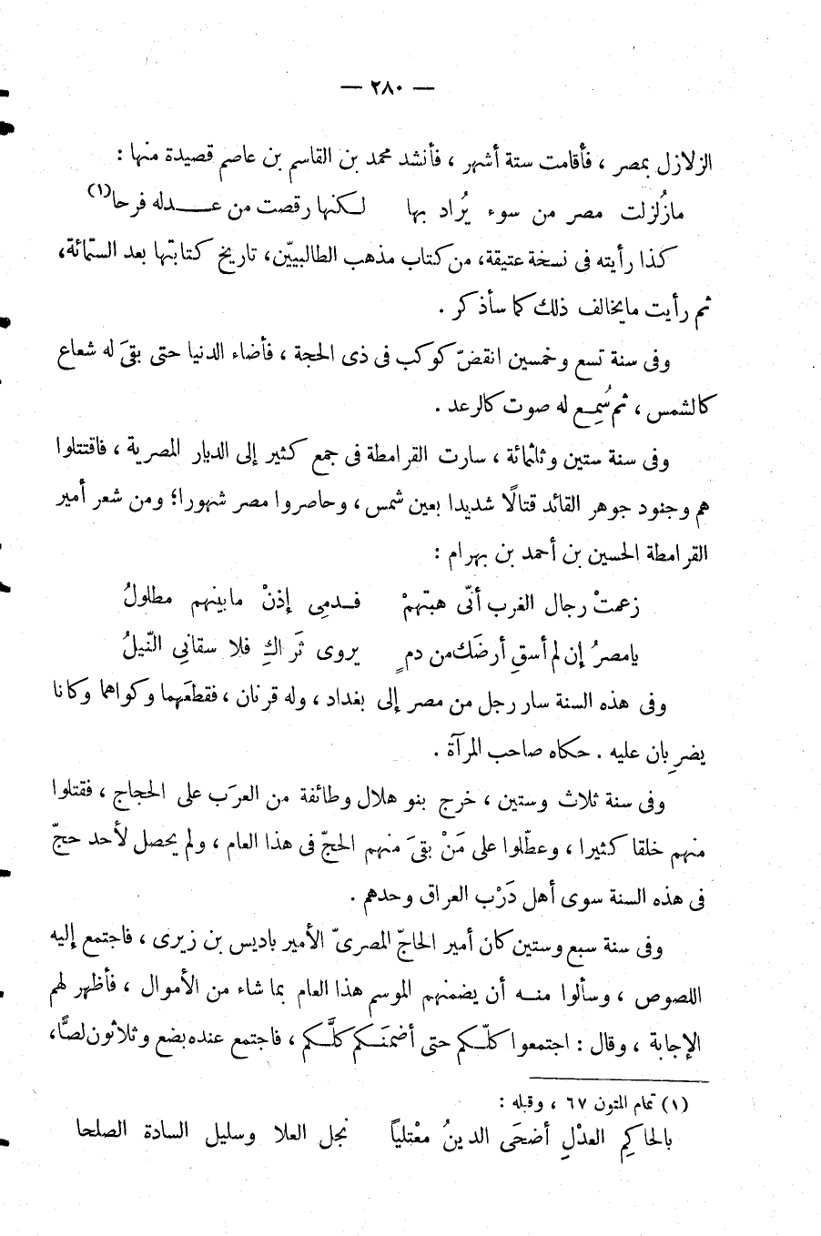وفي سنة ستين وثلثمائة، سارت القرامطة في جمع كثير إلى الديار المصرية، فاقتتلوا هم وجنود جوهر القائد قتالًا شديدا بعين شمس، وحاصروا مصر شهورا؛ ومن شعر أمير القرامطة الحسين بن أحمد بن بهرام: