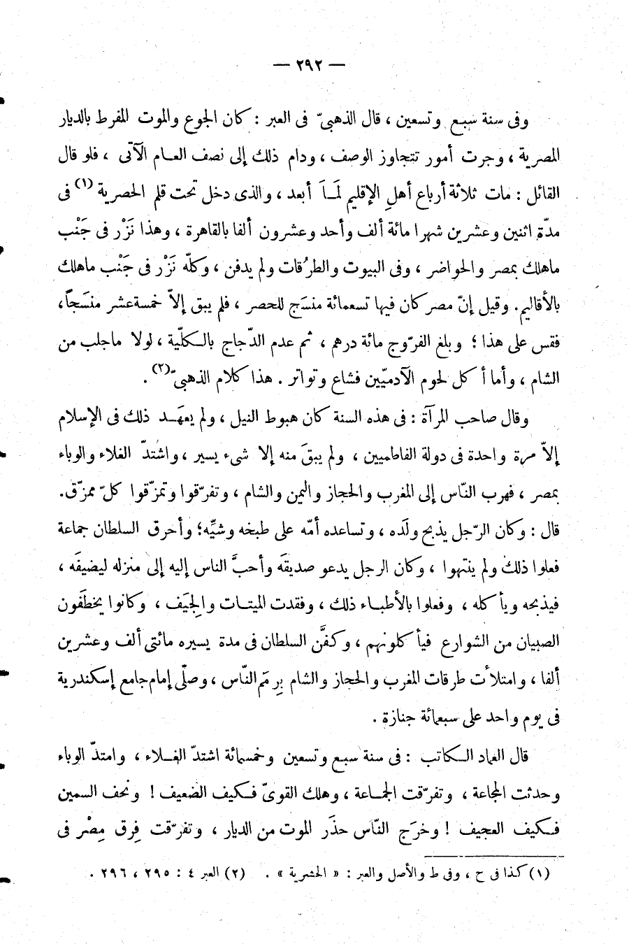 وفي سنة سبع وتسعين، قال الذهبي في العبر: كان الجوع والموت المفرط بالديار المصرية، وجرت أمور تتجاوز الوصف، ودام ذلك إلى نصف العام الآتي، فلو قال القائل: مات ثلاثة أرباع أهل الإقليم لما بعد، والذي دخل تحت قلم الحصرية (¬1) في مدة اثنين وعشرين شهرا مائة ألف وأحد وعشرون ألفا بالقاهرة، وهذا نزر في جنب ما هلك بمصر والحواضر، وفي البيوت والطرقات ولم يدفن، وكله نزر في جنب ما هلك بالأقاليم. وقيل: إن مصر كان فيها تسعمائة منسج للحصر، فلم يبق إلا خمسة عشر منسجًا، فقس على هذا؛ وبلغ الفروج مائة درهم، ثم عدم الدجاج بالكلية، لولا ما جلب من الشام، وأما أكل لحوم الآدميين فشاع وتواتر، هذا كلام الذهبي (¬2) .