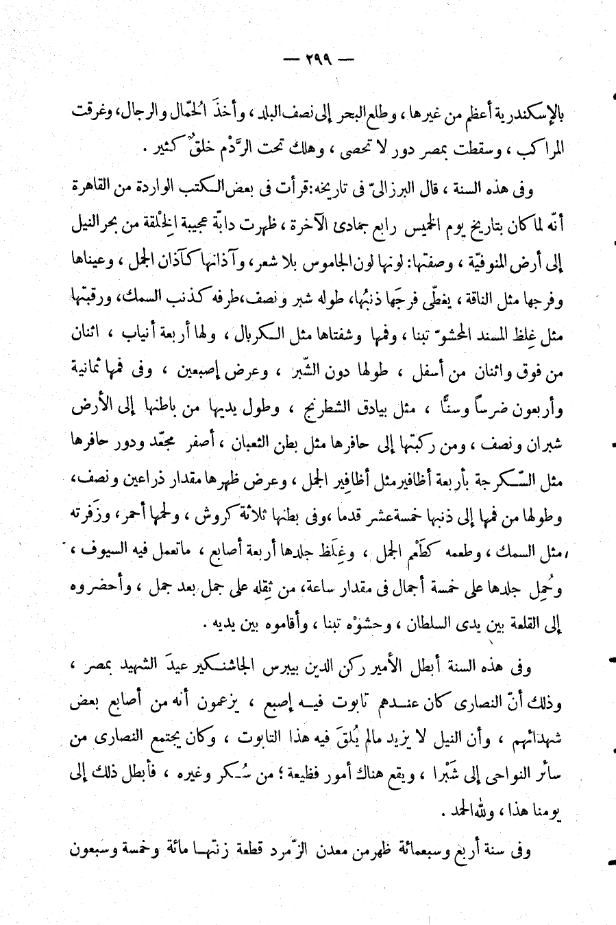 وفي هذه السنة، قال البرزالي في تاريخه: قرأت في بعض الكتب الواردة من القاهرة أنه لما كان بتاريخ يوم الخميس رابع جمادى الآخرة، ظهرت دابة عجيبة