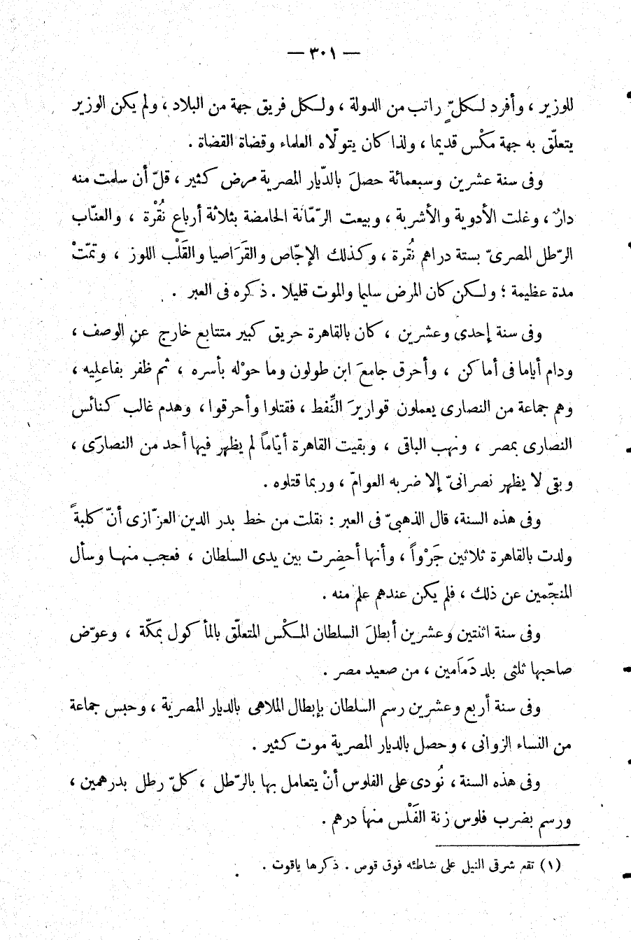 وفي سنة إحدى وعشرين، كان بالقاهرة حريق كبير متتابع خارج عن الوصف، ودام أياما في أماكن، وأحرق جامع ابن طولون وما حوله بأسره، ثم ظفر بفاعليه، وهم جماعة من النصارى يعملون قوارير النفط، فقتلوا وأحرقوا، وهدم غالب كنائس النصارى بمصر، ونهب الباقي، وبقيت القاهرة أيامًا لم يظهر فيها أحد من النصارى، وبقي لا يظهر نصراني إلا ضربه العوام، وربما قتلوه.