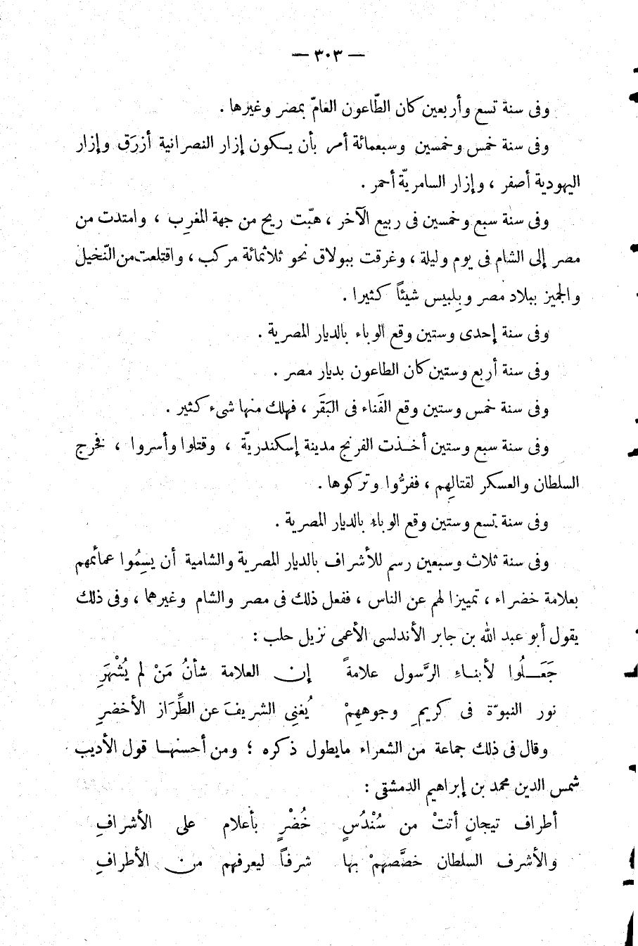 وفي سنة ثلاث وسبعين رسم للأشراف بالديار المصرية والشامية أن يسموا عمائمهم علامة خضراء، تمييزا لهم عن الناس، ففعل ذلك في مصر والشام وغيرهما، وفي ذلك يقول أبو عبد الله بن جابر الأندلسي الأعمى نزيل حلب: