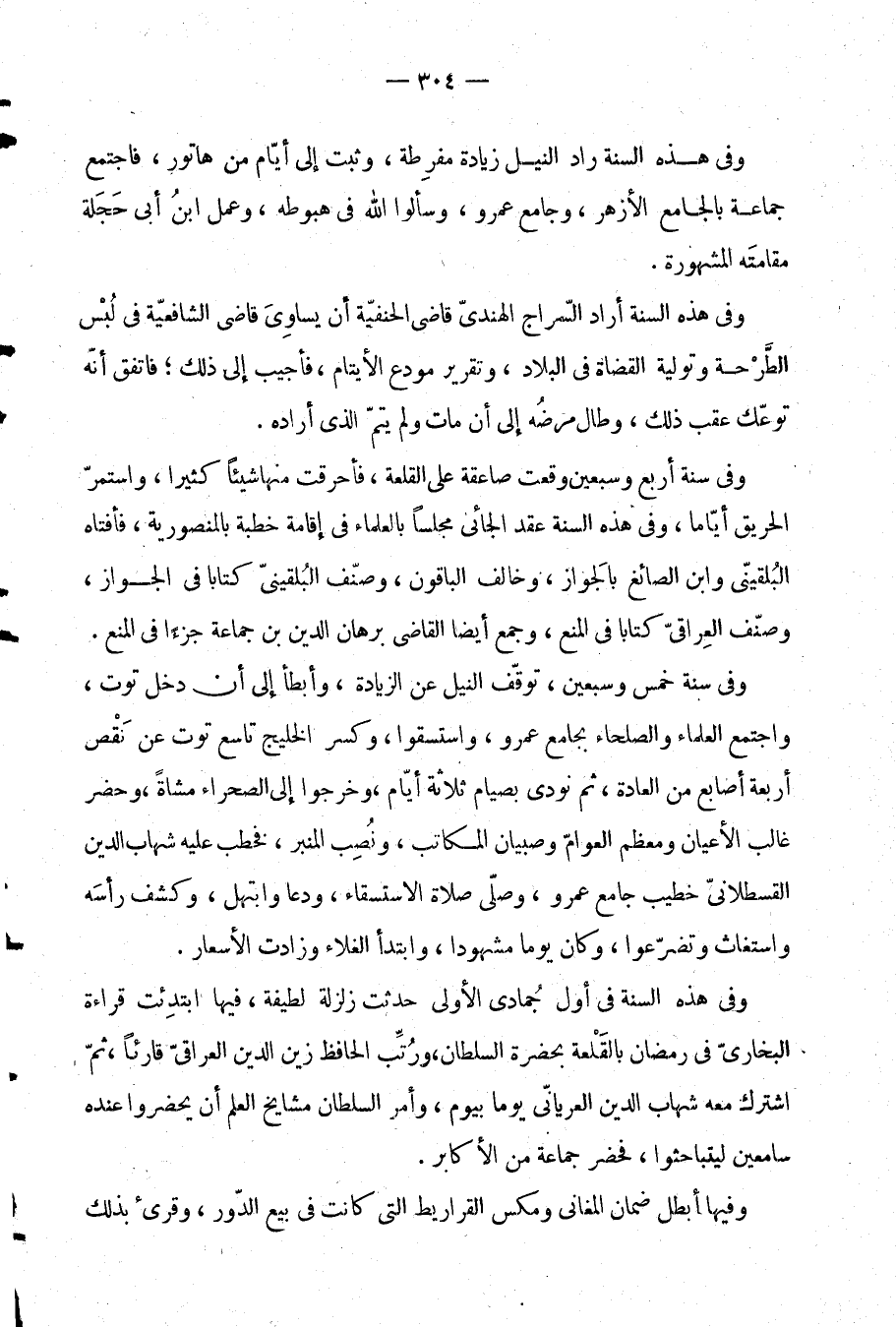 وفي سنة خمس وسبعين، توقف النيل عن الزيادة، وأبطأ إلى أن دخل توت، واجتمع العلماء والصلحاء بجامع عمرو، واستسقوا، وكسر الخليج تاسع توت عن نقص أربعة أصابع من العادة، ثم نودي بصيام ثلاثة أيام، وخرجوا إلى الصحراء مشاة، وحضر غالب الأعيان ومعظم العوام وصبيان المكاتب، ونصب المنبر، فخطب عليه شهاب الدين القسطلاني خطيب جامع عمرو، وصلى صلاة الاستسقاء، ودعا وابتهل، وكشف رأسه واستغاث وتضرعوا، وكان يوما مشهودا، وابتدأ الغلاء وزادت الأسعار.