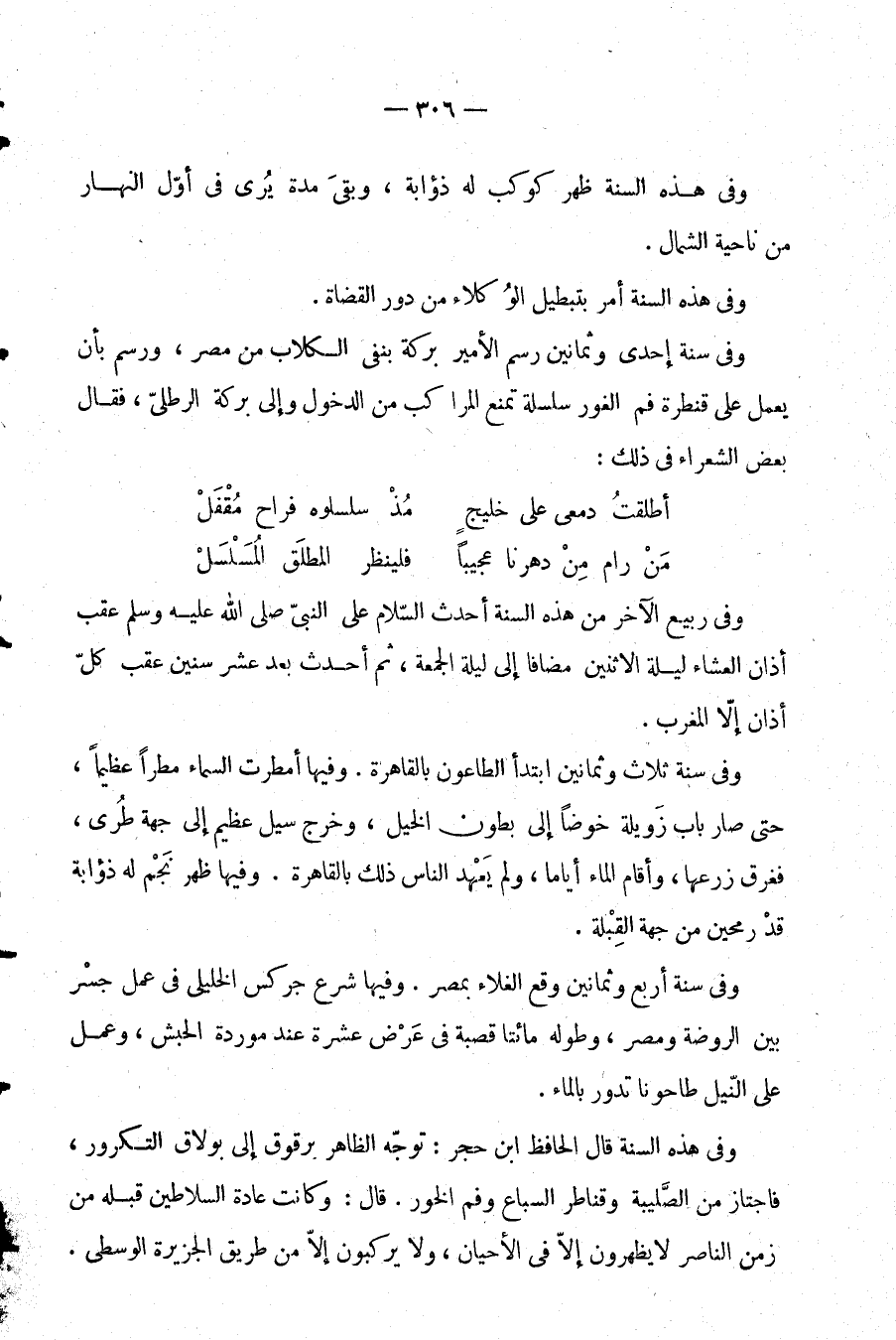 وفي سنة إحدى وثمانين رسم الأمير بركة بنفي الكلاب من مصر، ورسم بأن يعمل على قنطرة فم الغور سلسلة تمنع المراكب من الدخول وإلى بركة الرطلي، فقال بعض الشعراء في ذلك: