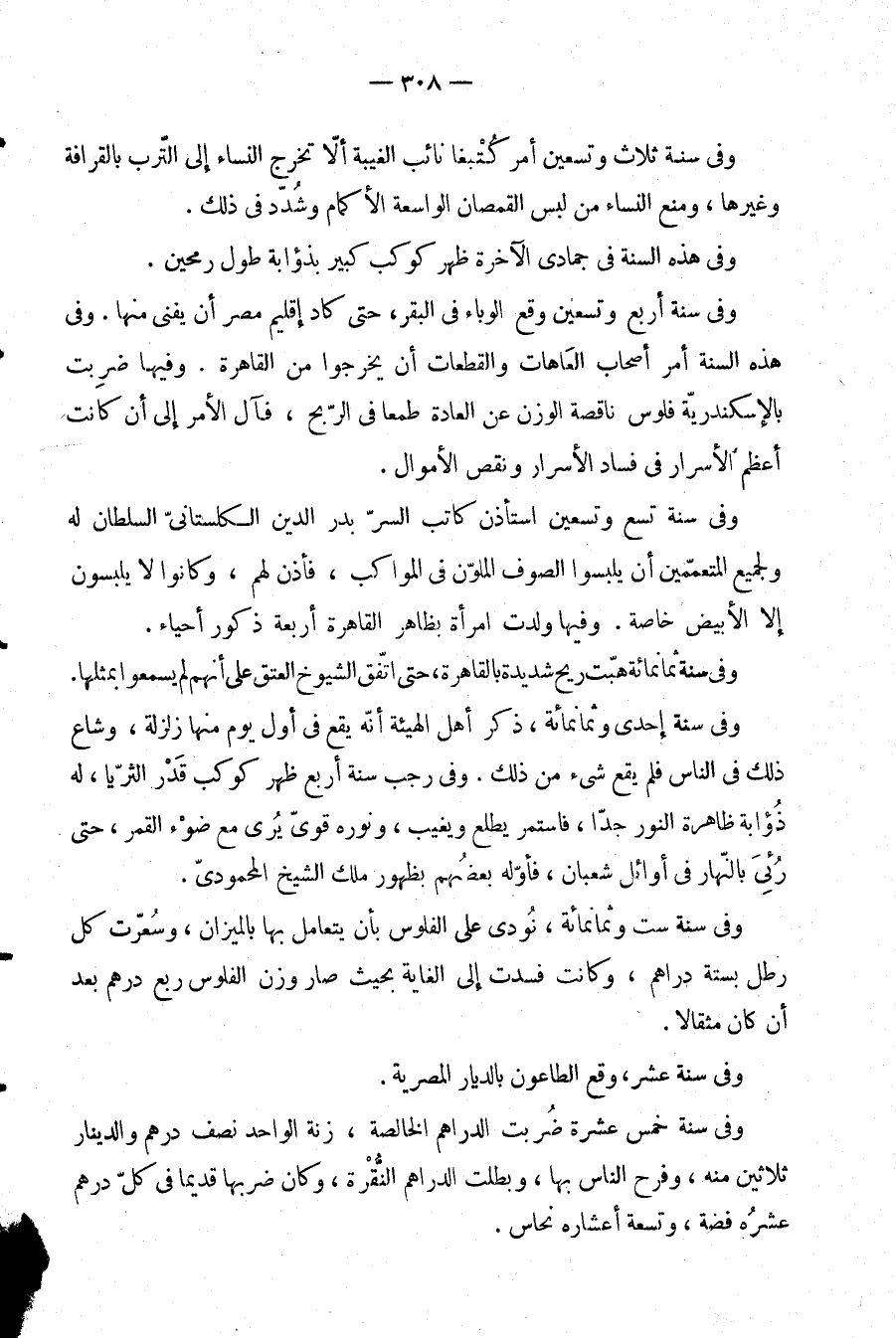 وفي سنة؟؟ وثمانمائة، نودي على الفلوس بأن يتعامل بها بالميزان، سعرت كل رطل ستة دراهم، وكانت فسدت إلى الغاية بحيث صار وزن الفلوس ربع درهم بعد أن كان مثقالا.