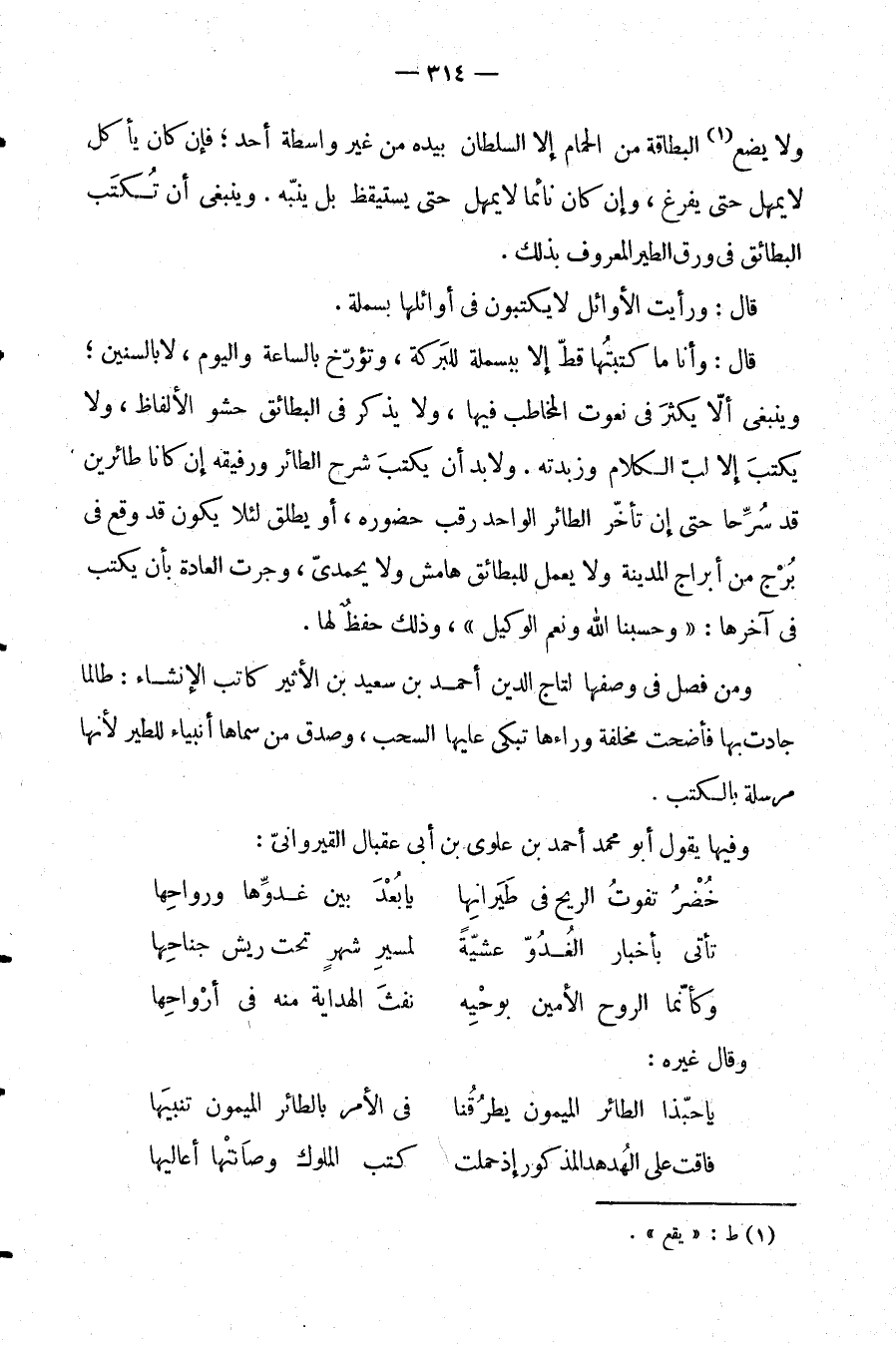 قال: وأنا ما كتبتها قط إلا ببسملة للبركة، وتؤرخ بالساعة واليوم، لا السنين؛ وينبغي ألا يكثر في نعوت المخاطب فيها، ولا يذكر في البطائق حشو الألفاظ، ولا يكتب إلا لب الكلام وزبدته. ولا بد أن يكتب شرح الطائر ورفيقه إن كانا طائرين قد سرحا حتى إن تأخر الطائر الواحد رقب حضوره، أو يطلق لئلا يكون قد وقع في برج من أبراج المدينة، ولا يعمل للبطائق هامش ولا يحمدي، وجرت العادة بأن يكتب في آخرها: "وحسبنا الله ونعم الوكيل"، وذلك حفظ لها.
