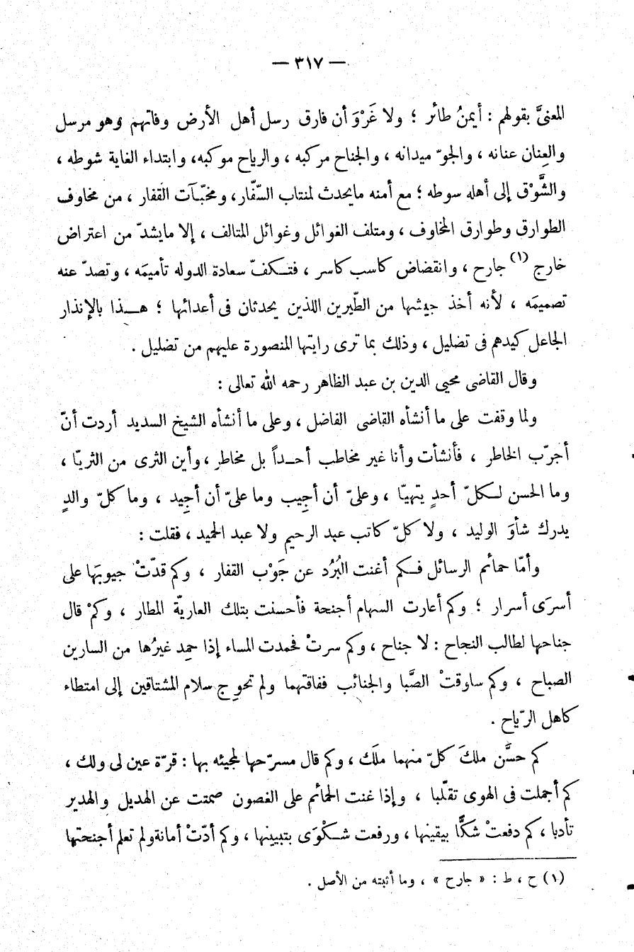 وأما حمائم الرسائل فكم أغنت البرد عن جوب القفار، وكم قدت جيوبها على أسرى أسرار؛ وكم أعارت السهام أجنحة فأحسنت بتلك العارية المطار، وكم قال جناحها لطالب النجاح: لا جناح، وكم سرت فحمدت المساء إذا حمد غيرها من السارين الصباح، وكم ساوقت الصبا والجنائب فقاقتهما ولم تحوج سلام المشتاقين إلى امتطاء كاهل الرياح.
