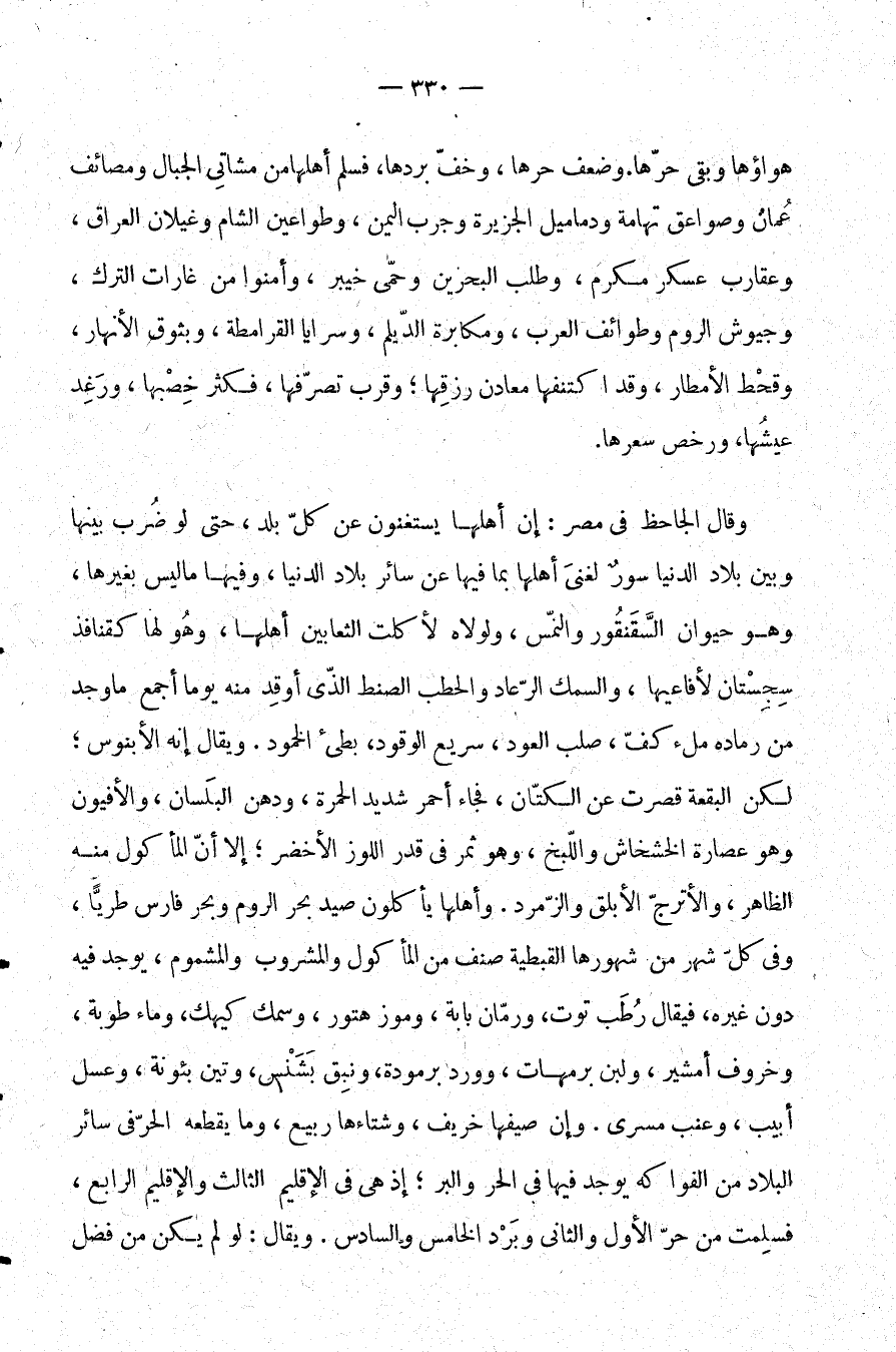 وقال الجاحظ في مصر: إن أهلها يستغنون عن كل بلد، حتى لو ضرب بينها وبين بلاد الدنيا سور لغني أهلها بما فيها عن سائر بلاد الدنيا، وفيها ما ليس بغيرها، وهو حيوان السقنقور والنمس، ولولاه لأكلت الثعابين أهلها، وهو لها كقنافذ سجستان لأفاعيها، والسمك الرعاد والحطب الصنط الذي أوقد منه يوما أجمع ما وجد من رماده ملء كف، صلب العود، سريع الوقود، بطيءالخمود. ويقال: إنه الأبنوس؛ لكن البقعة قصرت عن الكتان، فجاء أحمر شديد الحمرة، ودهن البلسان، والأفيون وهو عصارة الخشخاش واللبخ، وهو ثمر في قدر اللوز الأخضر؛ إلا أن المأكول منه الظاهر، والأترج الأبلق والزمرد. وأهلها يأكلون صيد بحر الروم وبحر فارس طريًّا، وفي كل شهر من شهورها القبطية صنف من