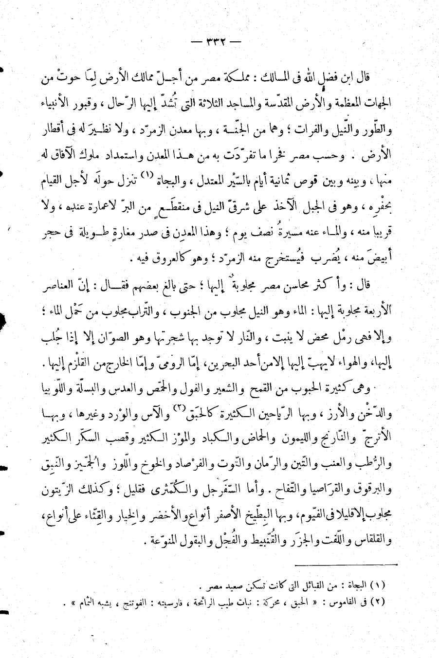 قال ابن فضل الله في المسالك: مملكة مصر من أجل ممالك الأرض لما حوت من الجهات المعظمة، والأرض المقدسة والمساجد الثلاثة التي تشد إليها الرحال، وقبور الأنبياء والطور والنيل والفرات؛ وهما من الجنة، وبها معدن الزمرد، ولا نظير له في أقطار الأرض. وحسب مصر فخرا ما تفردت به من هذا المعدن واستمداد ملوك الآفاق له منها، وبينه وبين قوص صمانية أيام بالسير المعتدل، والبجاة (¬1) تنزل حوله لأجل القيام بحفره، وهو في الجبل الآخذ على شرقي النيل في منقطع من البر لا عمارة عنده، ولا قريبا منه، والماء عنه مسيرة نصف يوم؛ وهذا المعدن في صدر مغارة طويلة في حجر أبيض منه، يضرب فيستخرج منه الزمرد؛ وهو كالعروق فيه.