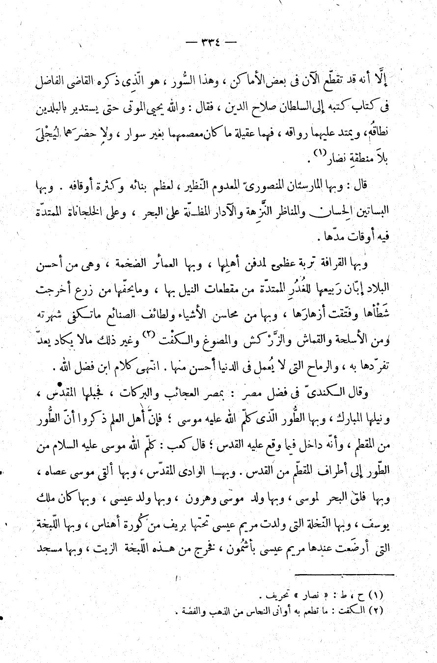 وبها القرافة تربة عظمى لمدفن أهلها، وبها العمائر الضخمة، وهي من أحسن البلاد إبان ربيعها للغدر الممتدة من مقطعات النيل بها، وما يحفها من زرع أخرجت شطأها وفتقت أزهارها، وبها من محاسن الأشياء ولطائف الصنائع ما تكفي شهرته ومن الأسلحة، والقماش والزركش والمصوغ والكفت (¬2) وغير ذلك ما لا يكاد يعد تفردها به، والرماح التي لا يعمل في الدنيا أحسن منها. انتهى كلام ابن فضل الله.