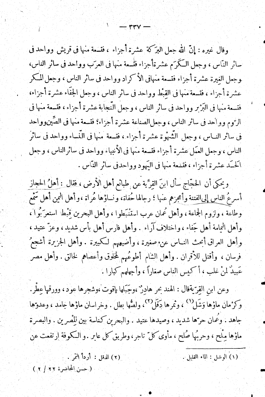 عشرة أجزاء، فتسعة منها في قريش وواحد في سائر الناس، وجعل الكرم عشرة أجزاء فتسعة منها في العرب وواحد في سائر الناس، وجعل الغيرة عشرة أجزاء فتسعة منها في الأكراد وواحد في سائر الناس، وجعل المكر عشرة أجزاء، فتسعة منها في القبط وواحد في سائر الناس، وجعل الجفاء عشرة أجزاء، فتسعة منها في البربر وواحد في سائر الناس، وجعل النجابة عشرة أجزاء، فتسعة منها في الروم وواحد في سائر الناس، وجعل الصناعة عشرة أجزاء؛ فتسعة منها في الصين وواحد في سائر الناس، وجعل الشهوة عشرة أجزاء، فتسعة منها في النساء وواحد في سائر الناس، وجعل العمل عشرة أجزاء فتسعة منها في الأنبياء وواحد في سائر الناس، وجعل الحسد عشرة أجزاء، فتسعة منها في اليهود وواحد في سائر الناس.