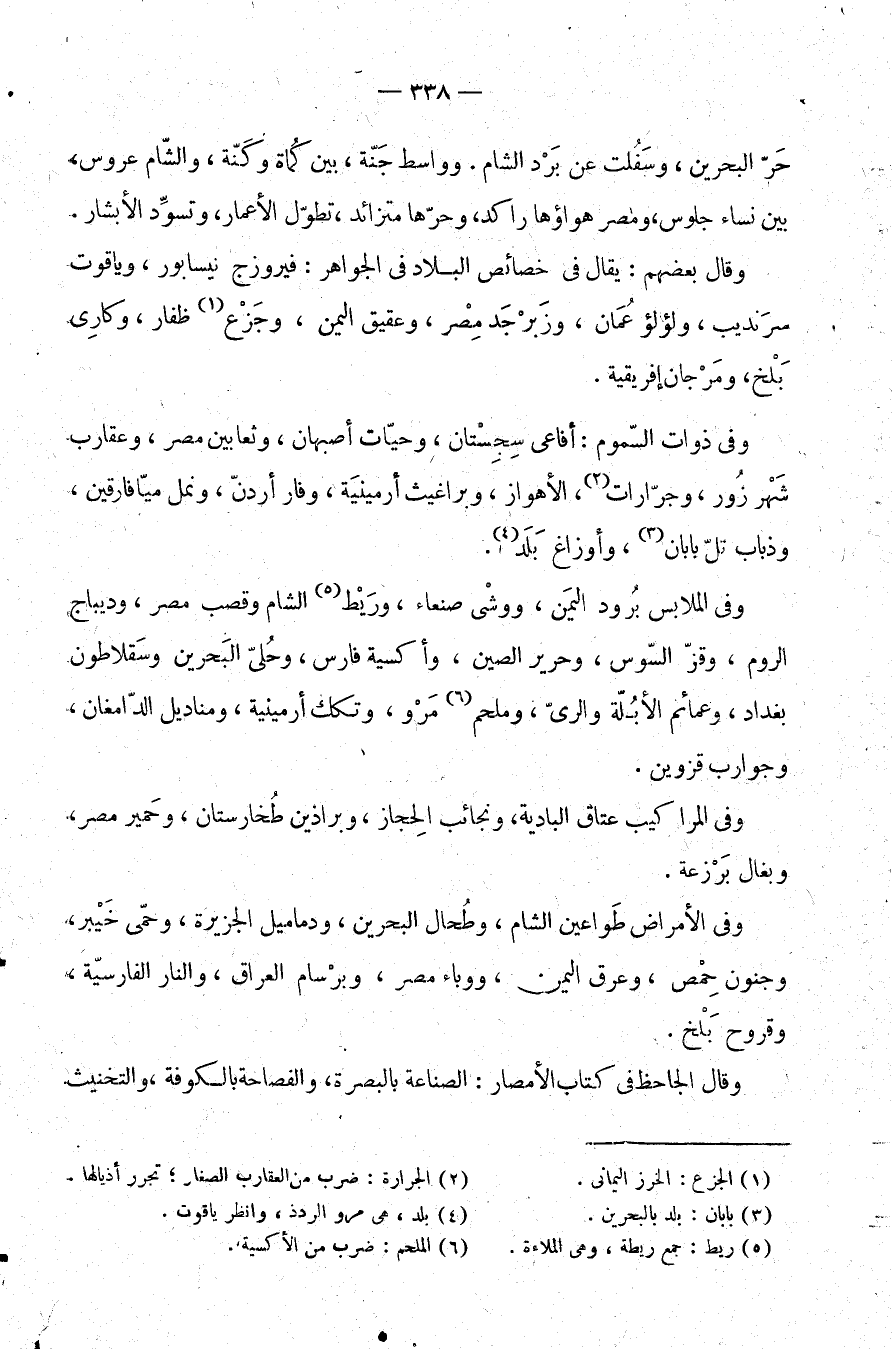 حر البحرين، وسفلت عن برد الشام، وواسط جنة، بين كماة وكنة، والشام عروس، بين نساء جلوس، ومصر هواؤها راكد، وحرها متزائد، تطول الأعمار، وتسود الأبشار.