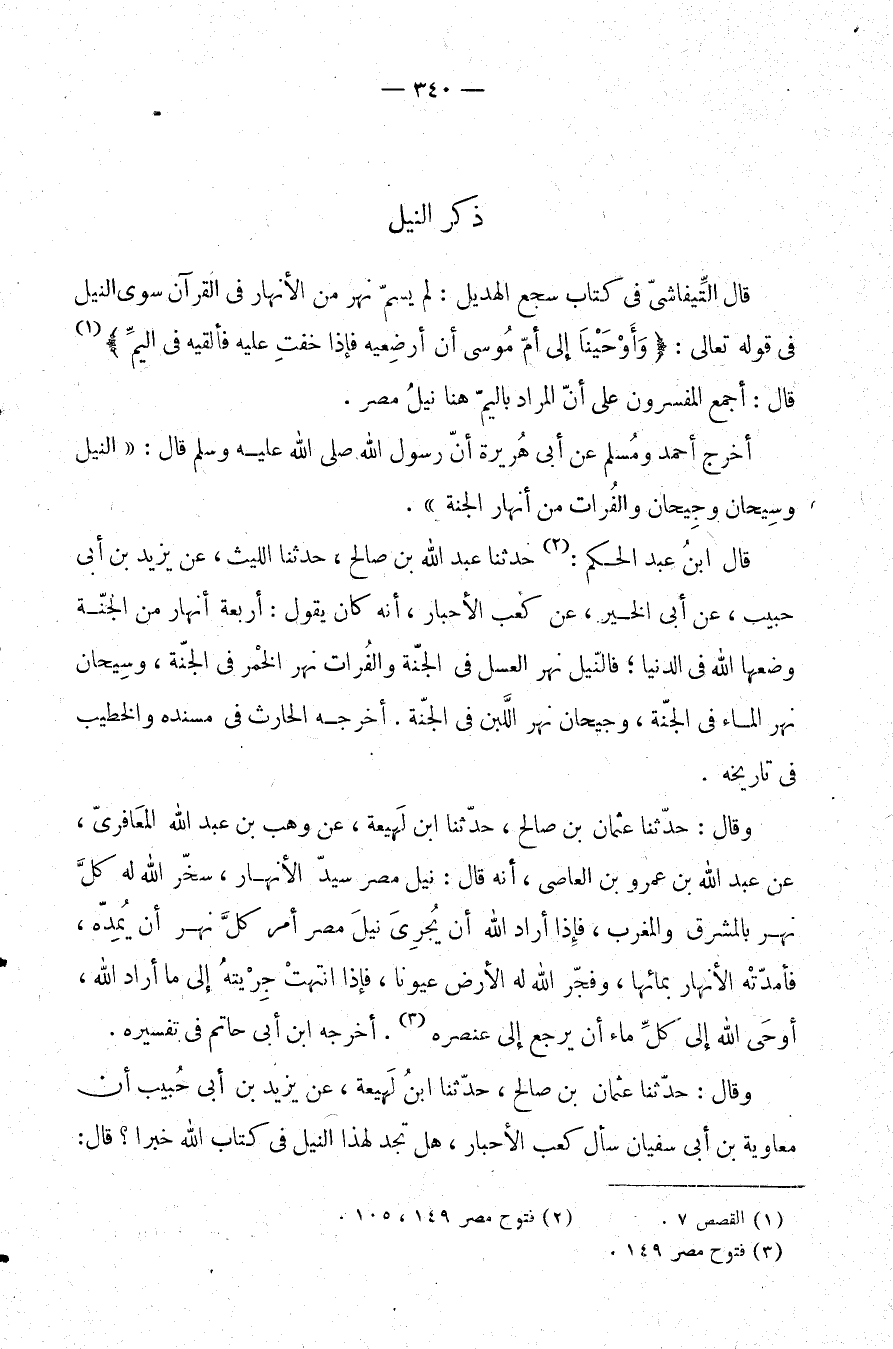 وقال: حدثنا عثمان بن صالح، حدثنا ابن لهيعة، عن وهب بن عبد الله المعافري، عن عبد الله بن عمرو بن العاصي، أنه قال: نيل مصر سيد الأنهار، سخر الله له كل نهر بالمشرق والمغرب، فإذا أراد الله أن يجري نيل مصر أمر كل نهر أن يمده، فأمدته الأنهار بمائها، وفجر الله له الأرض عيونا، فإذا انتهت جريته إلى ما أراد الله، أوحى الله إلى كل ماء أن يرجع إلى عنصره (¬3) . أخرجه ابن أبي حاتم في تفسيره.