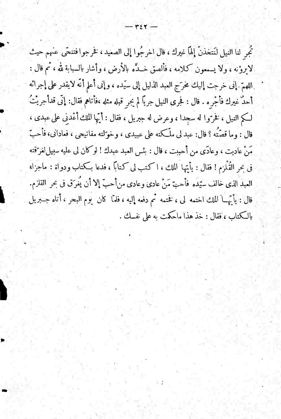 تجر لنا النيل لنتخذن إلهًا غيرك، قال: اخرجوا إلى الصعيد، فخرجوا فتنحى عنهم حيث لا يرونه، ولا يسمعون كلامه، فألصق خده بالأرض، وأشار بالسبابة لله، ثم قال: اللهم إني خرجت إليك مخرج العبد الذليل إلى سيده، وإني أعلم أنه لا يقدر على إجرائه أحد غيرك فأجره. قال: فجرى النيل جريًا لم يجر قبله مثله، فأتاهم فقال: إني قد أجريت لكم النيل، فخروا له سجدا، وعرض له جبريل، فقال: أيها الملك أعدني على عبدي، قال: وما قصته؟ قال: عبد لي ملكته على عبيدي، وخولته مفاتيحي، فعاداني، فأحب من عاديت، وعادى من أحببت، قال: بئس العبد عبدك! لو كان لي عليه سبيل لغرقته في بحر القلزم! فقال: يا أيها الملك، اأكتب لي كتابًا، فدعا بكتاب ودواة: ما جزاء العبد الذي خالف سيده فأحب من عادى وعادى من أحب إلا أن يغرق في بحر القلزم. قال: يا أيها الملك اختمه لي، فختمه ثم دفعه إليه، فلما كان يوم البحر، أتاه جبريل بالكتاب، فقال: خذ هذا ما حكمت به على نفسك.