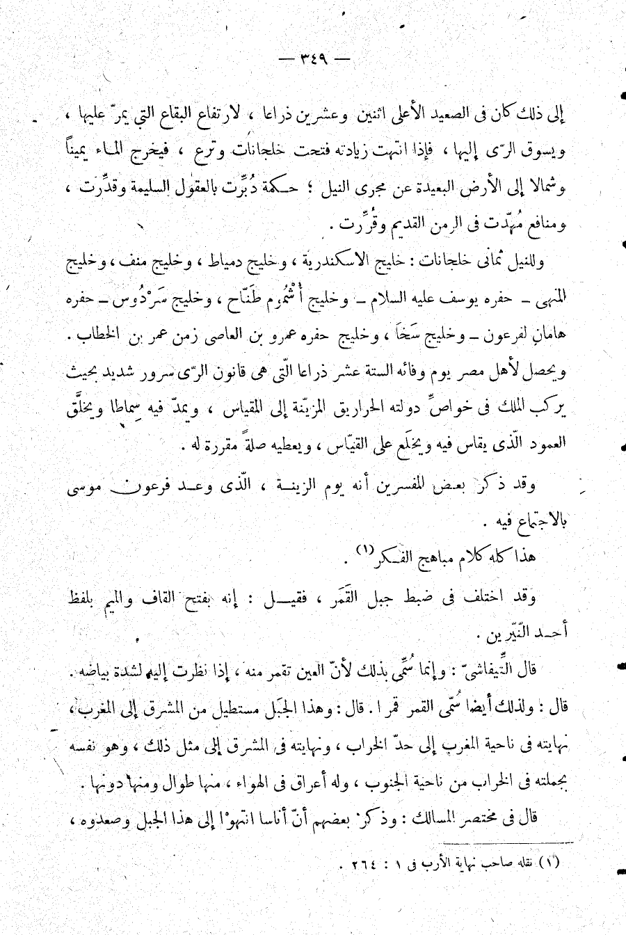 وللنيل ثماني خلجانات: خليج الإسكندرية، وخليج دمياط، وخليج منف، وخليج المنهى -حفره يوسف عليه السلام- وخليج أشموم طناح، وخليج سردوس -حفره هامان لفرعون- وخليج سخا، وخليج حفره عمرو بن العاصي زمن عمر بن الخطاب. ويحصل لأهل مصر يوم وفائه الستة عشر ذراعا التي هي قانون الري سرور شديد بحيث يركب الملك في خواص دولته الحراريق المزينة إلى المقياس، ويمد فيه سماطا ويخلق العمود الذي يقاس فيه، ويخلع على القياس، ويعطيه صلة مقررة له.