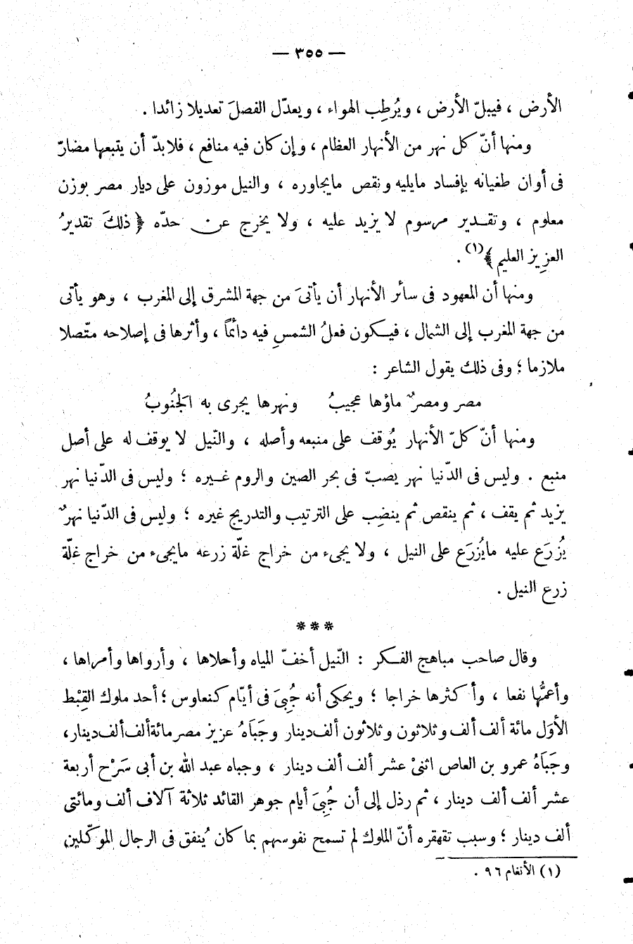 ومنها أن كل نهر من الأنهار العظام، وإن كل فيه منافع، فلا بد أن يتبعها مضار في أوان طغيانه بإفساد ما يليه ونقص ما يجاوره، والنيل موزون على ديار مصر بوزن معلوم، وتقدير مرسوم لا يزيد عليه، ولا يخرج عن حده {ذَلِكَ تَقْدِيرُ الْعَزِيزِ الْعَلِيمِ} (¬1) .