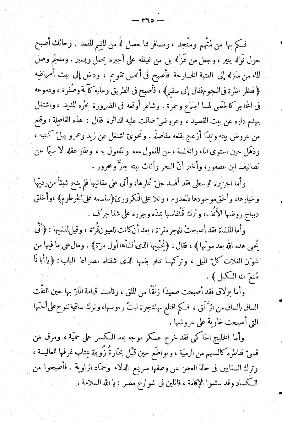 وأما بولاق فقد أصبحت صعيدًا زلقًا من الملق، وقامت قيامة المار بها حين التفت الساق بالساق من الزلق، فكم اقتلع بها شجرة لبت رءوسها، وترك ساقية تنوح على أختها التي أصبحت خاوية على عروشها.