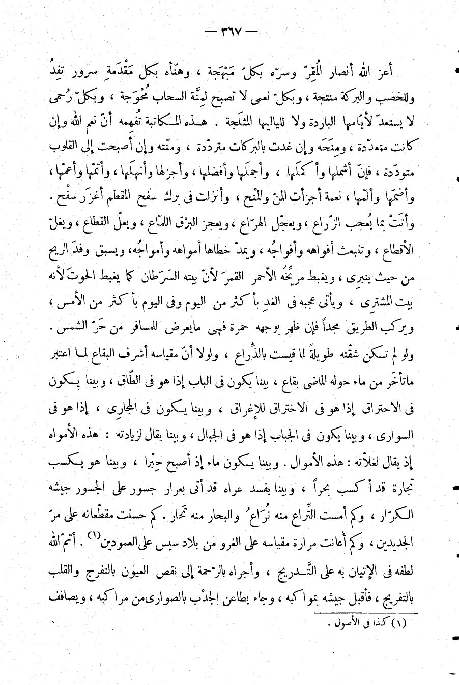 رحمى لا يستعد لأيامها الباردة ولا للياليها المثلجة. هذه المكاتبة تفهمه أن نعم الله وإن كانت متعددة، ومنحه وإن غدت بالبركات مترددة، ومنته وإن أصبحت إلى القلوب متوددة، فإن أشملها وأكملها، وأجملها وأفضلها، وأجزلها وأنهلها، وأتمها وأعمها، وأضمها وألمها، نعمة أجزأت المن والمنح، وأنزلت في برك سفح المقطم أغزر سفح. وأتت بما يعجب الزراع، ويعجل الهراع، ويعجز البرق اللماع، ويعل القطاع، ويغل الأقطاع، وتنبعث أفواهه وأفواجه، ويمد خطاها أمواهه وأمواجه، ويسبق وفد الريح من حيث ينبري، ويغيط مريخه الأحمر القمر؛ لأن بيته السرطان كما يغبط الحوت؛ لأنه بيت المشتري، ويأتي عجبه في الغد بأكثر من اليوم وفي اليوم بأكثر من الأمس، ويركب الطريق مجدًّا فإن ظهر بوجهه حمرة فهي ما يعرض للمسافر من حر الشمس. ولو لم تكن شقته طويلة لما قيست بالذراع، ولولا أن مقياسه أشرف البقاع لما اعتبر ما تأخر من ماء حوله الماضي بقاع، بينا يكون في الباب إذا هو في الطاق، وبينا يكون في الاحتراق إذا هو في الاختراق للإغراق، وبينا يكون في المجاري، إذا هو في السواري، وبينا يكون في الجباب إذا هو في الجبال، وبينا يقال لزيادته: هذه الامواه إذ يقال لغلاته: هذه الأموال. وبينا يكون ماء إذ أصبح حبرا، وبينا هو يكسب تجارة قد أكسب بحرًا، وبينا يفسد عراه قد أتى بعرار جسور على الجسور جيشه الكرار، وكم أمست التراع منه تراع والبحار منه تحار. كم حسنت مقطعاته على مر الجديدين، وكم أعانت مرارة مقياسه على الغرو من بلاد سيس على العمودين (¬1) . أتم الله لطفه في الإتيان به على التدريج، وأجراه بالرحمة إلى نقص العيون بالتفرج، والقلب بالتفريج، فأقبل جيشه بمواكبه، وجاء يطاعن الجدب بالصواري من مراكبه، ويصافف