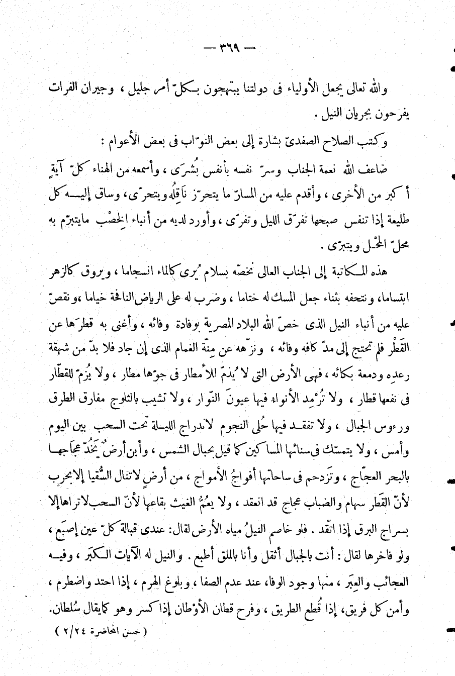 هذه المكاتبة إلى الجناب العالي تخصه بسلام يرى كالماء انسجامًا، ويروق كالزهر ابتساما، ونتحفه بثناء جعل المسك له ختاما، وضرب له على الرياض النافحة خياما، ونقص عليه من أنباء النيل الذي خص الله البلاد المصرية بوفادة وفائه، وأغنى به قطرها عن القطر فلم تحتج إلى مد كافه وفائه، ونزهه عن منة