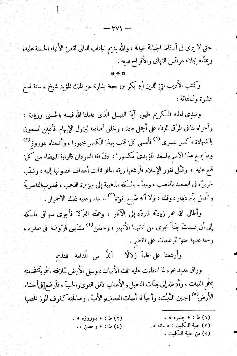 وكتب الأديب تقي الدين أبو بكر بن حجة بشارة عن الملك المؤيد شيخ، سنة تسع عشرة وثمانمائة.