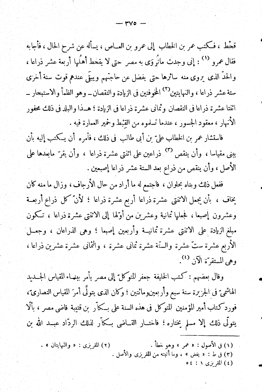 فاستشار عمر بن الخطاب علي بن أبي طالب في ذلك، فأمره أن يكتب إليه أن يبني مقياسا، وأن ينقص (¬3) ذراعين على اثنتي عشرة ذراعا، وأن يقر ما بعدها على الأصل، وأن ينقص من ذراع بعد الستة عشر ذراعا إصبعين.