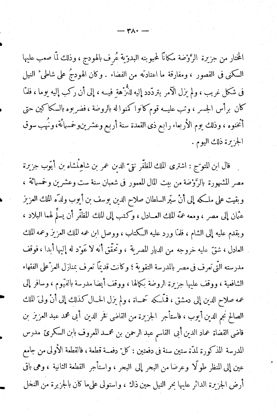 المظفر أن يسلم لهما البلاد، ويقدم عليه إلى الشام، فلما ورد عليه الكتاب، ووصل ابن عمه الملك العزيز وعمه الملك العادل، شق عليه خروجه من الديار المصرية، وتحقق أنه لا عود له إليها أبدًا، فوقف مدرسته التي تعرف في مصر بالمدرسة التقوية؛ وكانت قديمًا تعرف بمنازل العز على الفقهاء الشافعية، ووقف عليها جزيرة الروضة بكمالها، ووقف أيضا مدرسة بالفيوم، وسافر إلى عمه صلاح الدين إلى دمشق، فملكه حماة، ولم يزل الحال كذلك إلى أن ولي الملك الصالح نجم الدين أيوب، فاستأجر الجزيرة من القاضي فخر الدين أبي محمد عبد العزيز بن قاضي القضاة عماد الدين أبي القاسم عبد الرحمن بن محمد المعروف بابن السكري مدرس المدرسة المذكورة لمدة ستين سنة في دفعتين؛ كل دفعة قطعة، فالقطعة الأولى من جامع عين إلى المنظر طولا وعرضا من البحر إلى البحر، واستأجر القطعة الثانية، وهي باقي أرض الجزيرة الدائر عليها بحر النيل حينذاك، واستولى على ما كان للجزيرة من النخل