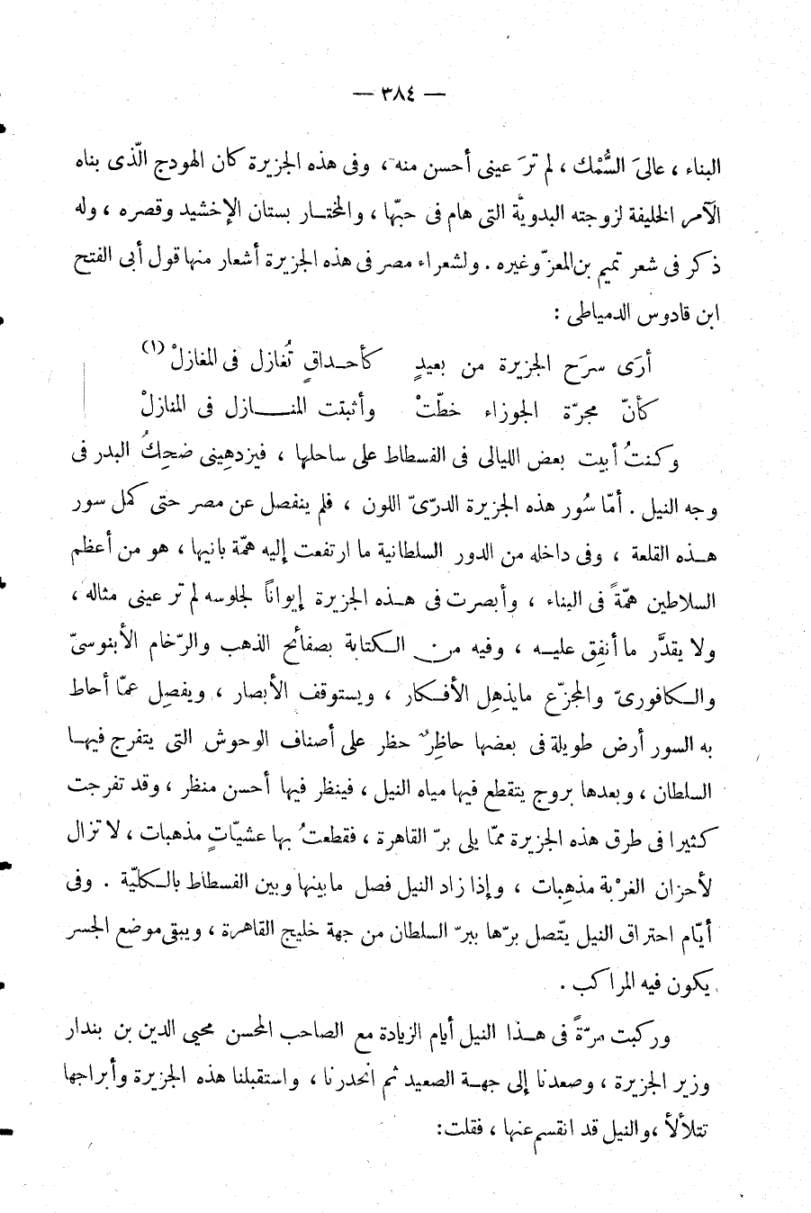 وركبت مرة في هذا النيل أيام الزيادة مع الصاحب المحسن محيي الدين بن بندار وزير الجزيرة، وصعدنا إلى جهة الصعيد ثم انحدرنا، واستقبلنا هذه الجزيرة وأبراجها تتلألأ، والنيل قد انقسم عنها، فقلت: