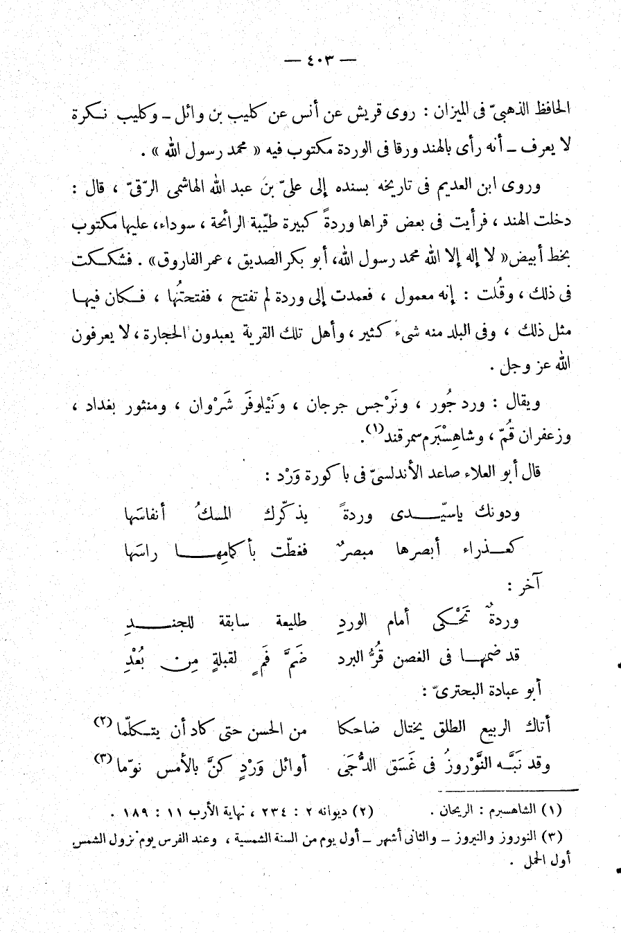 ويقال: ورد جور، ونرجس جرجان، ونيلوفر شروان، ومنثور بغداد، وزعفران قم، وشاهسبرم سمرقند (¬1) .