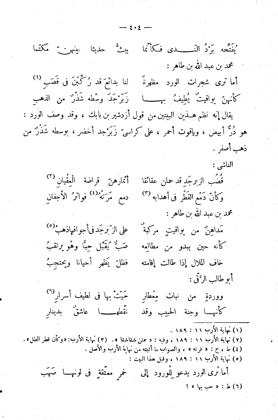 يقال: إنه نظم هذين البيتين من قول أزدشير بن بابك، وقد وصف الورد: وهو در أبيض، وياقوت أحمر، على كراسي زبرجد أخضر، بوسطه شذر من ذهب أصفر.