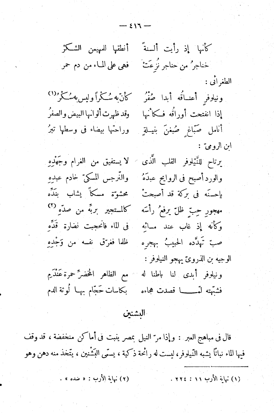 قال في مباهج العبر: وإذا مر النيل بمصر ينبت في أماكن منخفضة، قد وقف فيها الماء نباتًا يشبه النيلوفر، ليست له رائحة ذكية، يسمى البشنين، يتخذ منه دهن وهو