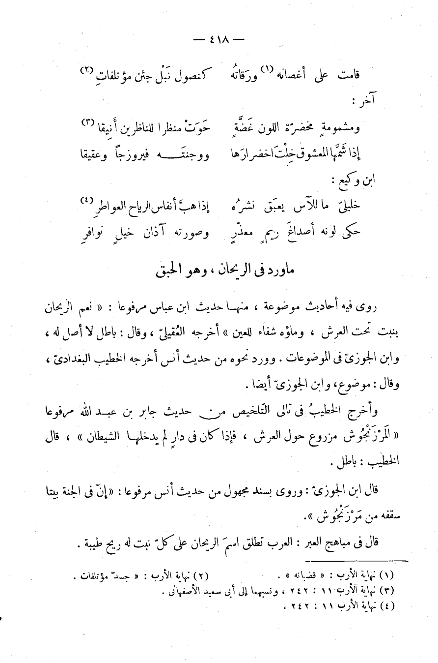 قال في مباهج العبر: العرب تطلق اسم الريحان على كل نبت له ريح طيبة.