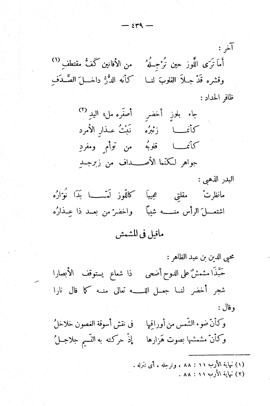 أما ترى اللوز حين ترجله ... من الأفانين كف مقتطف (¬1)