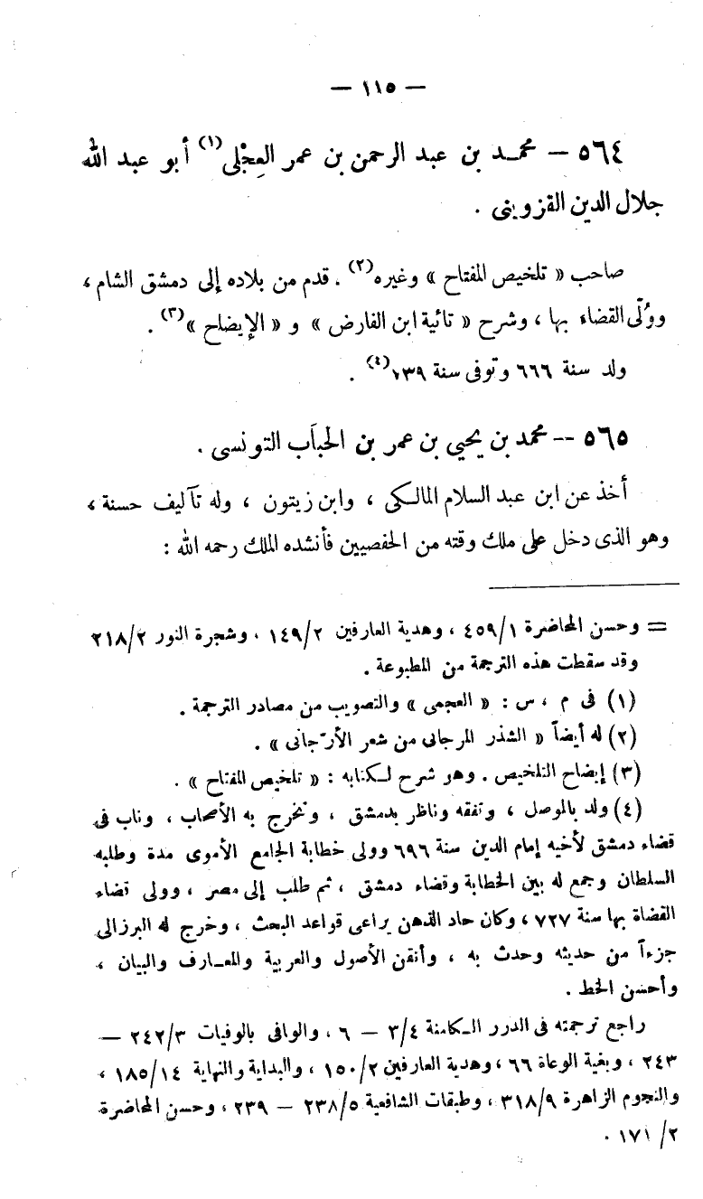 صاحب «تلخيص المفتاح» وغيره (2). قدم من بلاده إلى دمشق الشام، وولّى القضاء بها، وشرح «تائية ابن الفارض» و «الإيضاح» (3).