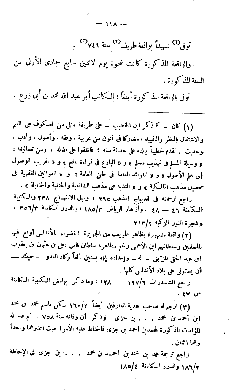 (2) واقعة مشهورة بظاهر طريف من الجزيرة الخضراء بالأندلس أوقع فيها بالمسلمين وسلطانهم ابن الأعمى رغم مظاهرة سلطان فاس: على بن عثمان بن يعقوب ابن عبد الحق المزّينى-له-وإمداده إياه بستين ألفا وكاد العدو-حينئذ- أن يستولى على بلاد الأندلس كلها. راجع الشذرات 6/ 127 - 128، وما ذكر بهامش الكتيبة الكامنة ص 47.