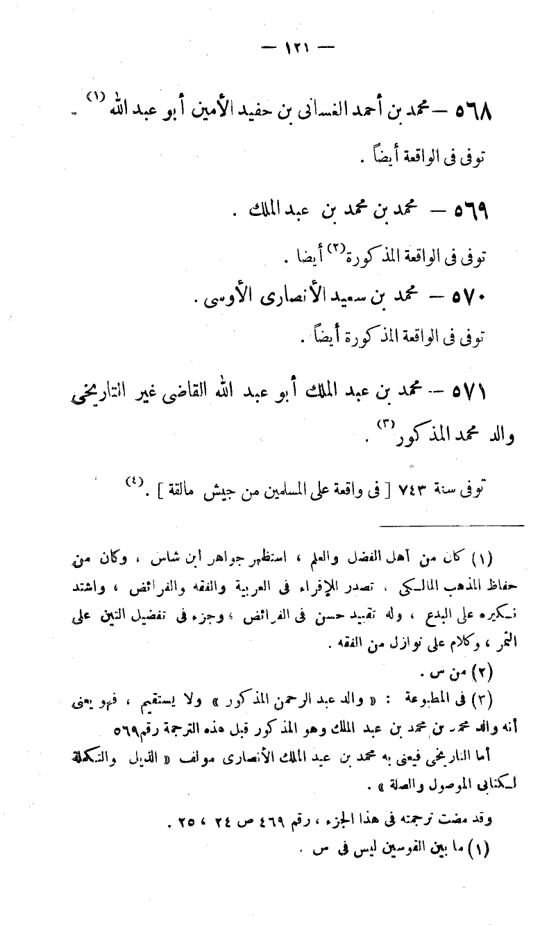 (3) فى المطبوعة: «والد عبد الرحمن المذكور» ولا يستقيم، فهو يعنى أنه والد محمد بن محمد بن عبد الملك وهو المذكور قبل هذه الترجمة رقم 569 أما التاريخى فيعنى به محمد بن عبد الملك الأنصارى مؤلف «الذيل والتكملة لكتابى الموصول والصلة». وقد مضت ترجمته فى هذا الجزء، رقم 469 ص 24، 25.