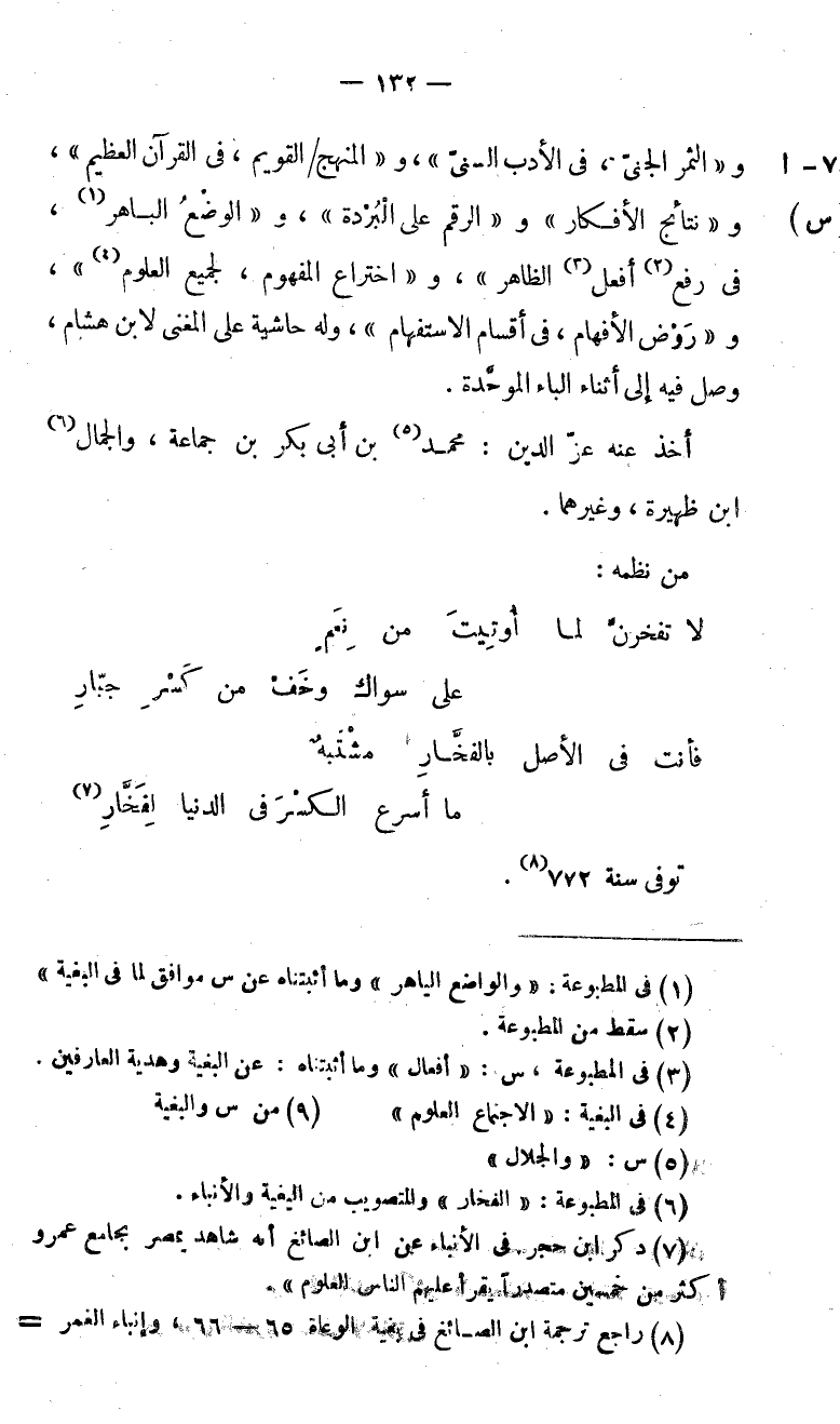 (8) راجع ترجمة ابن الصائغ فى بغية الوعاة 65 - 66، وإنباء الغمر-