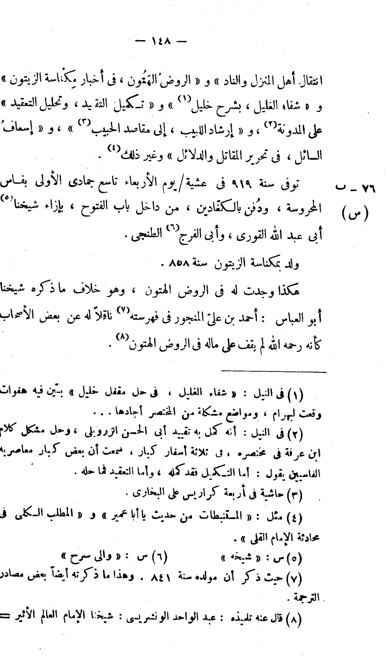 (2) فى النيل: أنه كمل به تقييد أبى الحسن الزروبلى، وحل مشكل كلام ابن عرفة فى مختصره، فى ثلاثة أسفار كبار، سمعت أن بعض كبار معاصريه الفاسيين يقول: أما التكميل فقد كمله، وأما التعقيد فما حله.