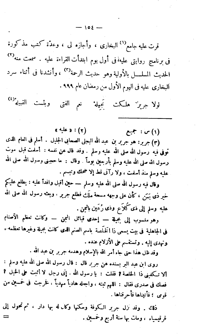 (3) جرير: هو جرير بن عبد الله البجلى الصحابى الجليل. أسلم فى العام الذى توفى فيه رسول الله صلّى الله عليه وسلم. وقد قال عن نفسه: أسلمت قبل موت رسول الله صلّى الله عليه وسلم بأربعين يوما. وقال: ما حجبنى رسول الله صلّى الله عليه وسلم منذ أسلمت، ولا رآنى قط إلا ضحك وتبسم. وقال فيه رسول الله صلّى الله عليه وسلم-حين أقبل وافدا عليه: يطلع عليكم خير ذى يمن، كأن على وجهه مسحة ملك فطلع جرير، وبعثه رسول الله صلّى الله عليه وسلم إلى ذى كلاع وذى رعين باليمن. وهو منسوب إلى بجيلة-إحدى قبائل اليمن-وكانت تعظم الأصنام فى الجاهلية فى بيت يسمى ذا الخلصة باسم الصنم الذى كانت بجيلة وغيرها تعظمه، وتهدى إليه. وتستقسم على الأزلام عنده. وقد ظل هذا حتى جاء أمر الله بالإسلام وهدمه جرير بن عبد الله. روى ابن عبد البر بسنده عن جرير قال: قال رسول الله صلّى الله عليه وسلم: ألا تكفينى ذا الخلصة؟ فقلت: يا رسول الله، إنّي رجل لا أثبت على الخيل؟ فصك فى صدرى فقال: اللهم ثبته، واجعله هاديا مهديا، فخرجت فى خمسين من قومى؛ فأتيناها فأحرقناها. ذلك، وقد نزل جرير الكوفة وسكنها وكان له بها دار، ثم تحول إلى قرقيسياء، ومات بها سنة أربع وخمسين.