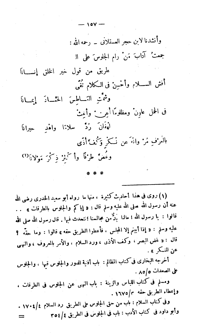 (1) روى فى هذا أحاديث كثيرة، منها ما رواه أبو سعيد الخدرى رضى الله عنه أن رسول الله صلّى الله عليه وسلم قال: «إياكم والجلوس بالطرقات». . قالوا: يا رسول الله! ما لنا بدّ من مجالسنا؛ نتحدث فيها. قال رسول الله صلّى الله عليه وسلم: «إذا أبيتم إلا المجلس، فأعطوا الطريق حقه» قالوا: وما حقّه؟ قال: «غض البصر، وكف الأذى، ورد السلام، والأمر بالمعروف، والنهى عن المنكر». أخرجه البخارى فى كتاب المظالم: باب أفنية الدور والجلوس فيها، والجلوس على الصعدات 5/ 85. ومسلم فى كتاب اللباس والزينة: باب النهى عن الجلوس فى الطرقات، وإعطاء الطريق حقه 3/ 1675. وفى كتاب السلام: باب من حق الجلوس على الطريق رد السلام 4/ 1704. وأبو داود فى كتاب الأدب: باب فى الجلوس فى الطريق 4/ 354