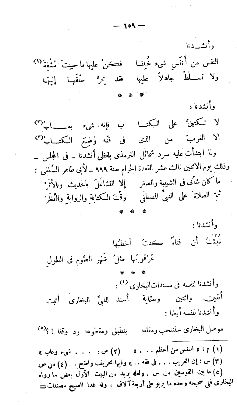 (5) ما بين القوسين من س. ولعله يريد من البيت الأول بعض ما رواه البخارى ففى صحيحه وحده ما يربو على أربعة آلاف، وله عدا الصيح؟ ؟ ؟ مصنفات-