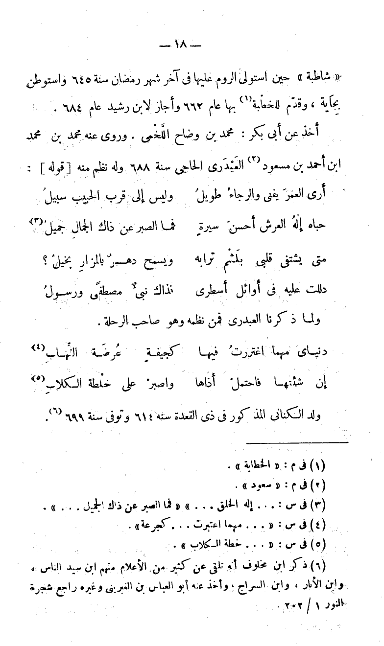 «شاطبة» حين استولى الروم عليها فى آخر شهر رمضان سنة 645 واستوطن بجاية، وقدّم للخطبة (1) بها عام 662 وأجاز لابن رشيد عام 684.