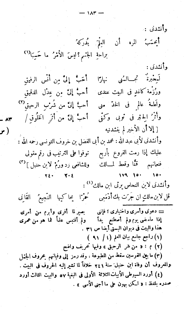 (3) ما بين القوسين سقط من المطبوعة: وقد رمز إلى وفياتهم بحروف الجمّل والمعروف أن وفاة ابن حنبل سنة 241 خلافا لما تشير إليه الحروف فى البيت.
