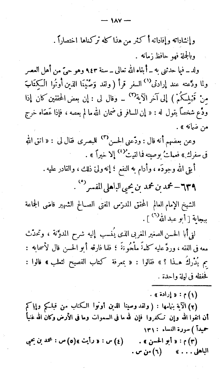 ولد-فيما حدثنى به-أبقاه الله تعالى-سنة 943 وهو حى من أهل العصر ولما ودّعته عند إرادتى (1) السفر قرأ {(وَلَقَدْ وَصَّيْنَا الَّذِينَ أُوتُوا الْكِتابَ مِنْ قَبْلِكُمْ)} إلى آخر الآية (2) -وقال لى: إن بعض المحققين كان إذا ودّع شخصا يقول له: «إن المسافر فى ضمان الله ما لم يعصه، فإذا عصاه خرج من ضمانه».