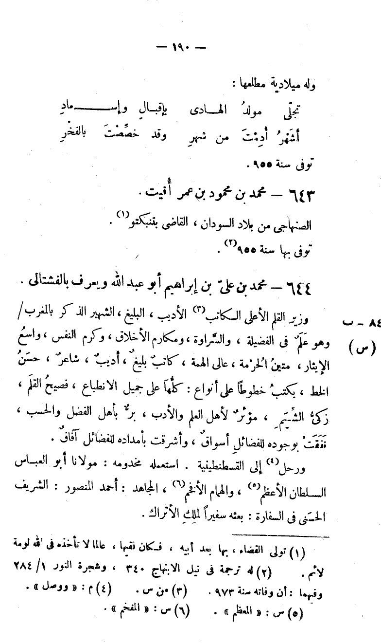 وزير القلم الأعلى الكاتب (3) الأديب، البليغ، الشهير الذكر بالمغرب/ وهو علم فى الفضيلة، والسّراوة، ومكارم الأخلاق، وكرم النفس، واسع الإيثار، متين الحرمة، عالى الهمة، كاتب بليغ، أديب، شاعر، حسن الخط، يكتب خطوطا على أنواع: كلّها على جميل الانطباع، فصيح القلم، زكىّ الشّيم، مؤثر لأهل العلم والأدب، برّ بأهل الفضل والحسب، نفقت بوجوده للفضائل أسواق، وأشرقت بأمداده للفضائل آفاق.