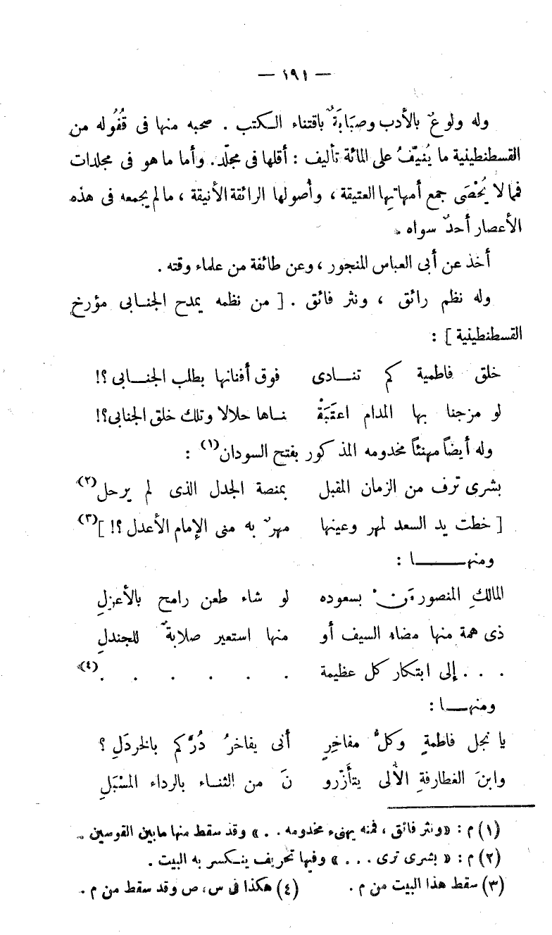 وله نظم رائق، ونثر فائق. [من نظمه يمدح الجنابى مؤرخ القسطنطينية]: