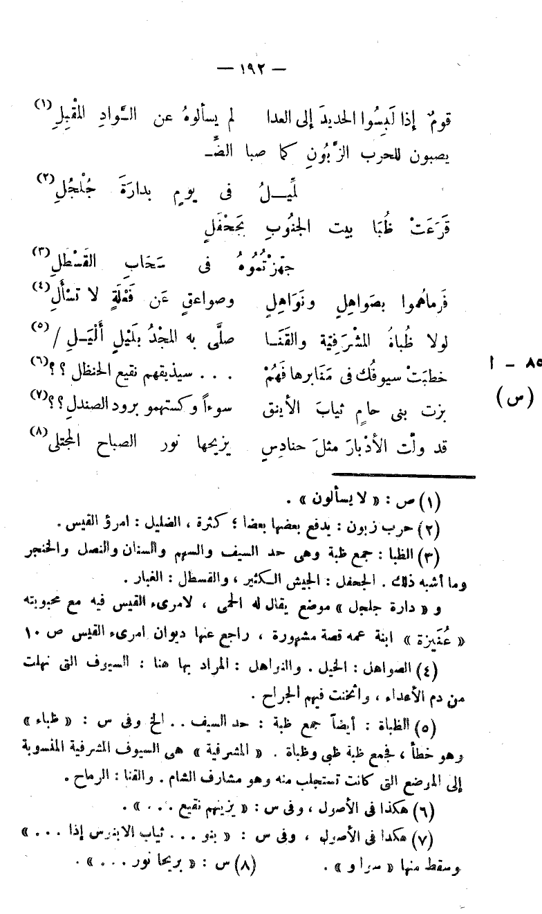 (5) الظباة: أيضا جمع ظبة: حد السيف. . الخ وفى س: «ظباء» وهو خطأ، فجمع ظبة ظبى وظباة. «المشرفية» هى السيوف المشرفية المنسوبة إلى الموضع التى كانت تستجلب منه وهو مشارف الشام. والقنا: الرماح.