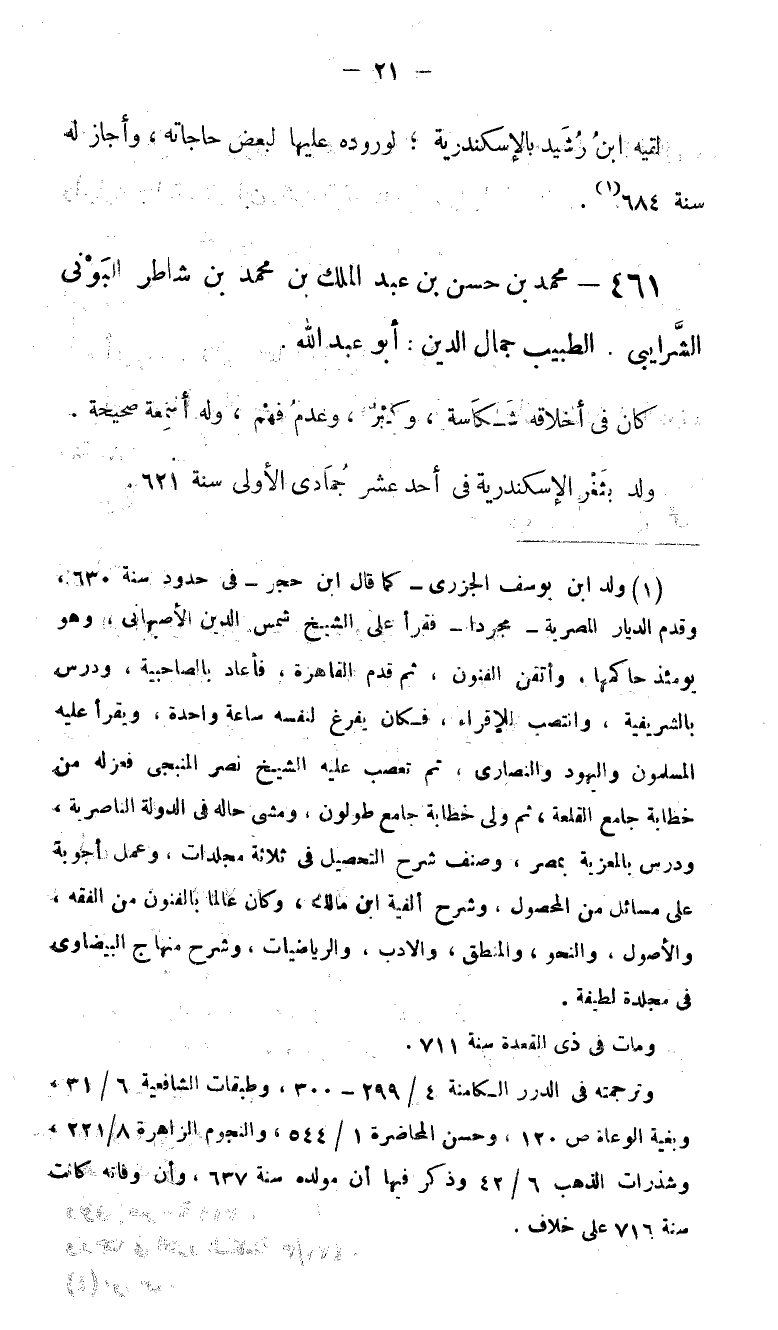 (1) ولد ابن يوسف الجزرى-كما قال ابن حجر-فى حدود سنة 630، وقدم الديار المصرية-مجردا-فقرأ على الشيخ شمس الدين الأصبهانى، وهو يومئذ حاكمها، وأتقن الفنون، ثم قدم القاهرة، فأعاد بالصاحبية، ودرس بالشريفية، وانتصب للإقراء، فكان يفرغ لنفسه ساعة واحدة، ويقرأ عليه المسلمون واليهود والنصارى، ثم تعصب عليه الشيخ نصر المنبجى فعزله من خطابة جامع القلعة، ثم ولى خطابة جامع طولون، ومشى حاله فى الدولة الناصرية، ودرس بالمعزية بمصر، وصنف شرح التحصيل فى ثلاثة مجلدات، وعمل أجوبة على مسائل من المحصول، وشرح ألفية ابن مالك، وكان عالما بالفنون من الفقه، والأصول، والنحو، والمنطق، والادب، والرياضيات، وشرح منهاج البيضاوى فى مجلدة لطيفة. ومات فى ذى القعدة سنة 711. وترجمته فى الدرر الكامنة 4/ 299 - 300، وطبقات الشافعية 6/ 31، وبغية الوعاة ص 120، وحسن المحاضرة 1/ 544، والنجوم الزاهرة 8/ 221، وشذرات الذهب 6/ 42 وذكر فيها أن مولده سنة 637، وأن وفاته كانت سنة 716 على خلاف.