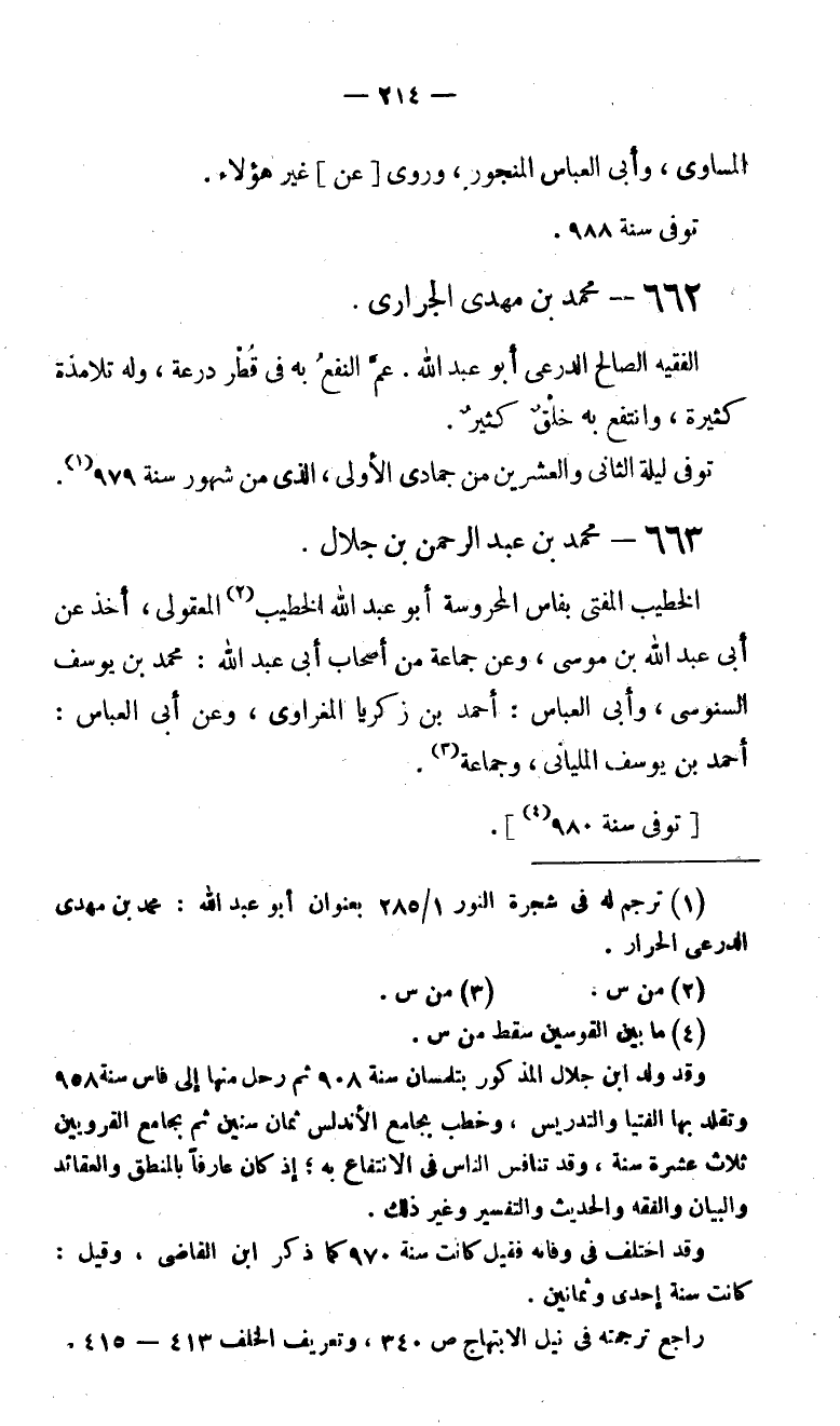 (4) ما بين القوسين سقط من س. وقد ولد ابن جلال المذكور بتلمسان سنة 908 ثم رحل منها إلى فاس سنة 958 وتقلد بها الفتيا والتدريس، وخطب بجامع الأندلس ثمان سنين ثم يجامع القروبين ثلاث عشرة سنة، وقد تنافس الناس فى الانتفاع به؛ إذ كان عارفا بالمنطق والعقائد والبيان والفقه والحديث والتفسير وغير ذلك. وقد اختلف فى وفاته فقيل كانت سنة 970 كما ذكر ابن القاضى، وقيل: كانت سنة إحدى وثمانين. راجع ترجمته فى نيل الابتهاج ص 340، وتعريف الخلف 413 - 415.