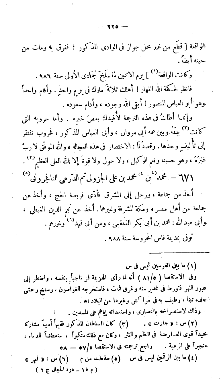 (3) كان السلطان المذكور فقيها أديبا مشاركا مجيدا قوى العارضة فى النظم والنثر، وكان مع ذلك متكبرا، متعطشا للدماء، متجبرا على الرعية. راجع ترجمته فى الاستقصاء 5/ 57 - 58